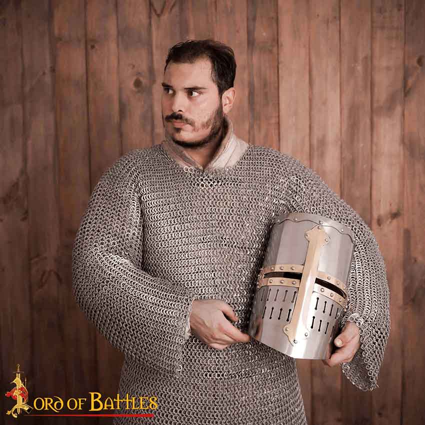 Leap into the legends of the Crusades with the magnificent 13th Century Great Helm. This awe-inspiring helmet is a testament to the skill and artistry of medieval armorers. The armour conjures visions of valiant knights and epic battles. With its authentic design and meticulous craftsmanship, this helm is the epitome of historical accuracy and timeless beauty.