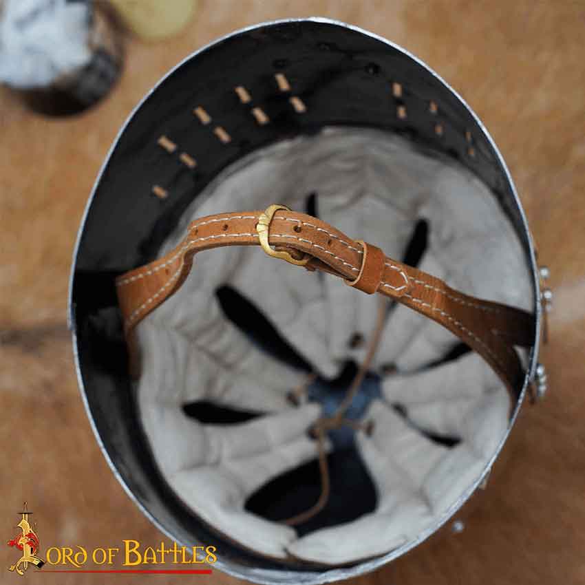 Inside the helmet, you’ll find a plush padded liner that provides both comfort and customization. This liner adjusts the fit of the helmet, helping it stay securely in place during intense combat. A robust leather chin strap with a brass buckle further enhances the helmet’s stability, thus giving you the confidence to fight with all your might.