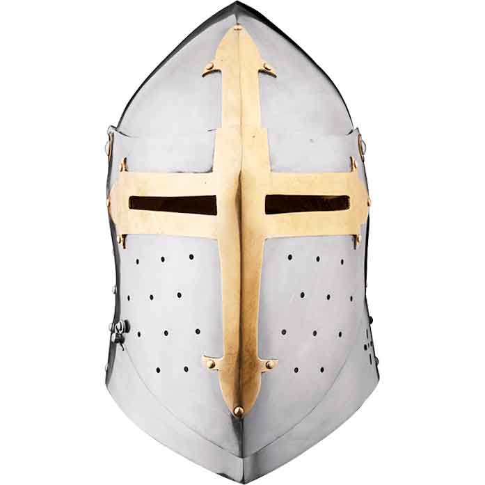 A variant of the medieval great helm, the sugar loaf helm possesses a more conical top than the original helmet design. The 14th Century Gilded Sugar Loaf Visored Helmet displays a golden cross shape over the front of the face. The steel helmet has a leather chin strap. As is common in helmets of the style, thin slits serve as eye holes, and other small openings appear along the front. Great helms sacrificed ventilation and peripheral vision in favor of the vastly superior protection offered. This unique medieval helmet, though, finds the best of both worlds with a visor that lifts to expose the face. Small hooks keep the visor in place during battle. No set of medieval armour can be complete without the right headgear, so be sure to check out this fantastic Crusader helmet!