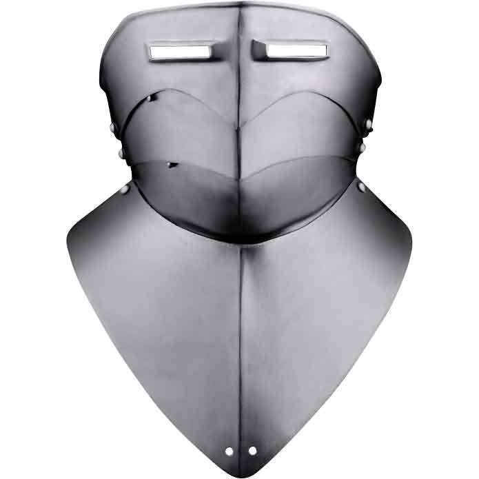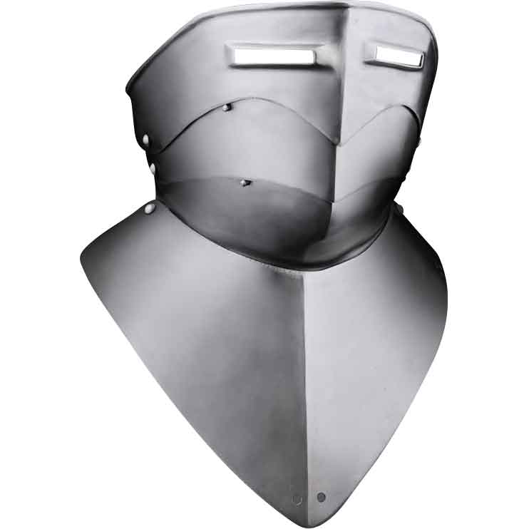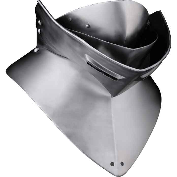 Do not forget the importance of protecting yourself before heading into battle or on a journey. Check out the 15th Century Gorget with Visor. Made from 16 gauge mild steel, this unique gorget protects the neck and the face. The gorget secures with straps in the back. It has a plate that protects the upper chest. There is a ridge down the center. Its bottom edge forms a steep point in the middle. At the point, there are two holes for attaching other pieces of armour.