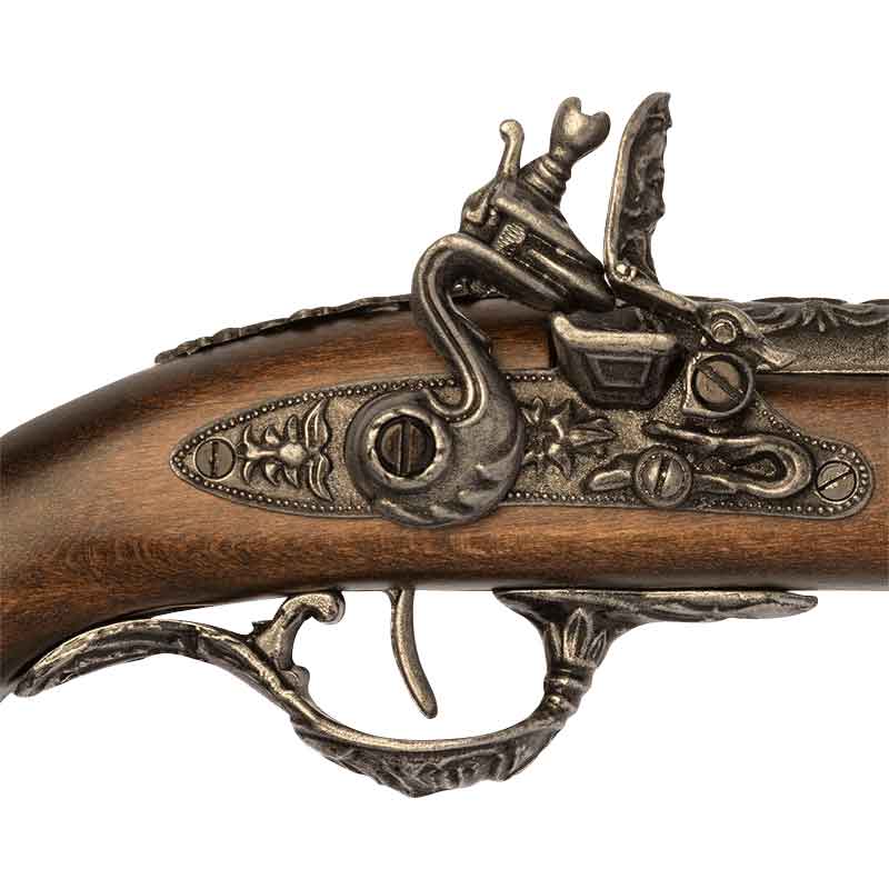 Captaining your ship, you spy an enemy vessel on the horizon. You pull out the 18th Century Burnished Flintlock Pistol, ready for battle. Made from metal and wood, this decorative replica firearm features a French design from the 18th century. It has a burnished barrel. It ends with a widened muzzle. The barrel features a raised design.