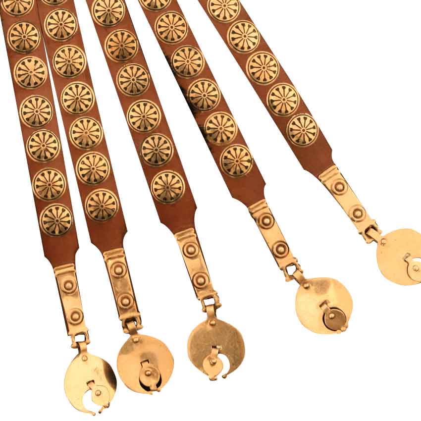 This Roman belt is something of an elaborate affair, featuring several unique touches that make it an impressive accent, to be sure. The 1st Century Roman Legionary Disc Belt serves well as an addition to any military based Roman costume or look. This belt is made entirely in high quality natural leather, featuring an old-world style, 1st century buckle to secure its closure. The belt is richly adorned with brass plates that are riveted into the leather, making it look very much like an accent that would have belonged to a Centurion, or at least an important member or leader of a cohort or legion. Attached to the belt are war skirt style tassets, which hang down are decorated with brass enameled rosette discs, as well as matching brass discs at the tasset tips, as well. Attached to the belt is also a pugio holder, which allows the belt to easily support your favorite Roman dagger when you wear it, too. The 1st Century Roman Legionary Disc Belt is a decorative accent, one that well fits the look of a Roman commander, making it the perfect accent to add in to your military look – assuming, of course, that you want to recreate the form of a powerful and influential Roman leader.