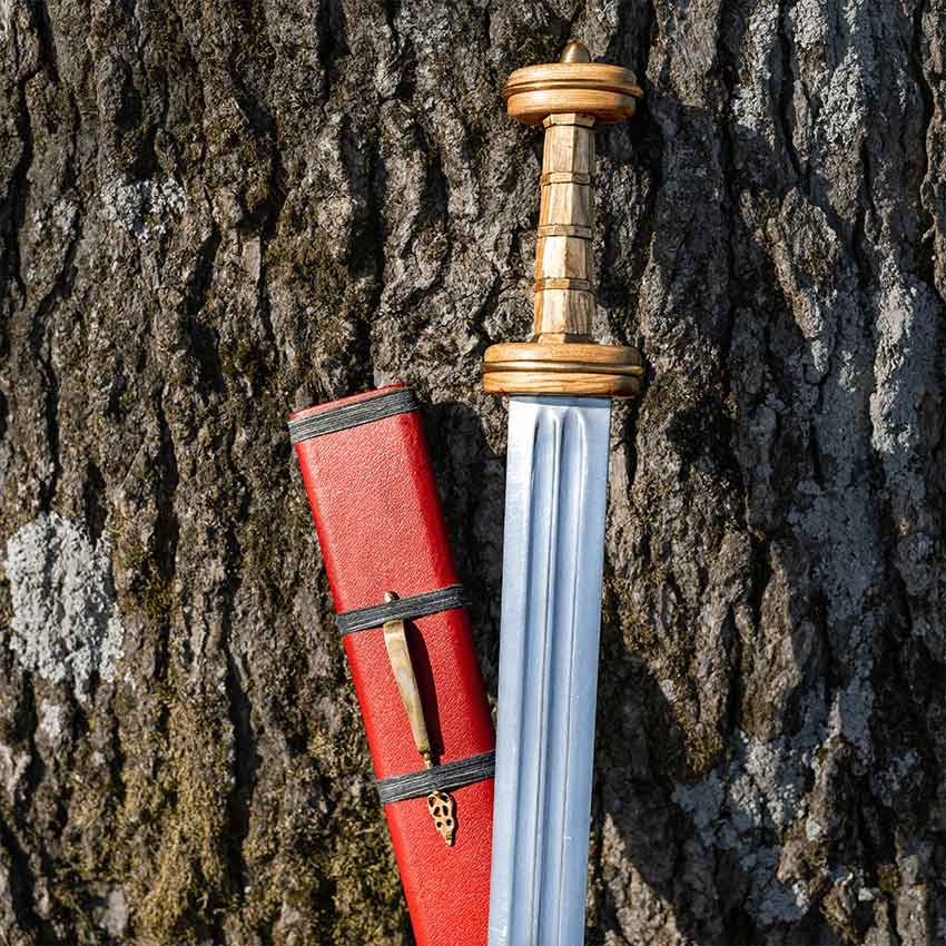 You hear your commander give orders for the battle. You are ready to take on the enemy as you wield the 3rd Century Roman Spatha Sword. Made from EN45 high carbon steel, this functional sword has a straight, double-edged blade with two wide fullers running down its length. The hilt features a disk-shaped crossguard and pommel. A brass ridge runs along the sides of each circular disk. Between the pommel and guard, there is a ridged grip. Hexagonal brass rings form the ridges and separate each wooden section of the grip. Finally, the sword comes with a wooden scabbard. Red leather wraps around the leather. The scabbard has black cord bands and brass fittings, including a loop for hanging the scabbard from a belt, not included. Bring the 3rd Century Roman Spatha Sword to a historical reenactment or add it your Roman sword collection. It looks great on display.