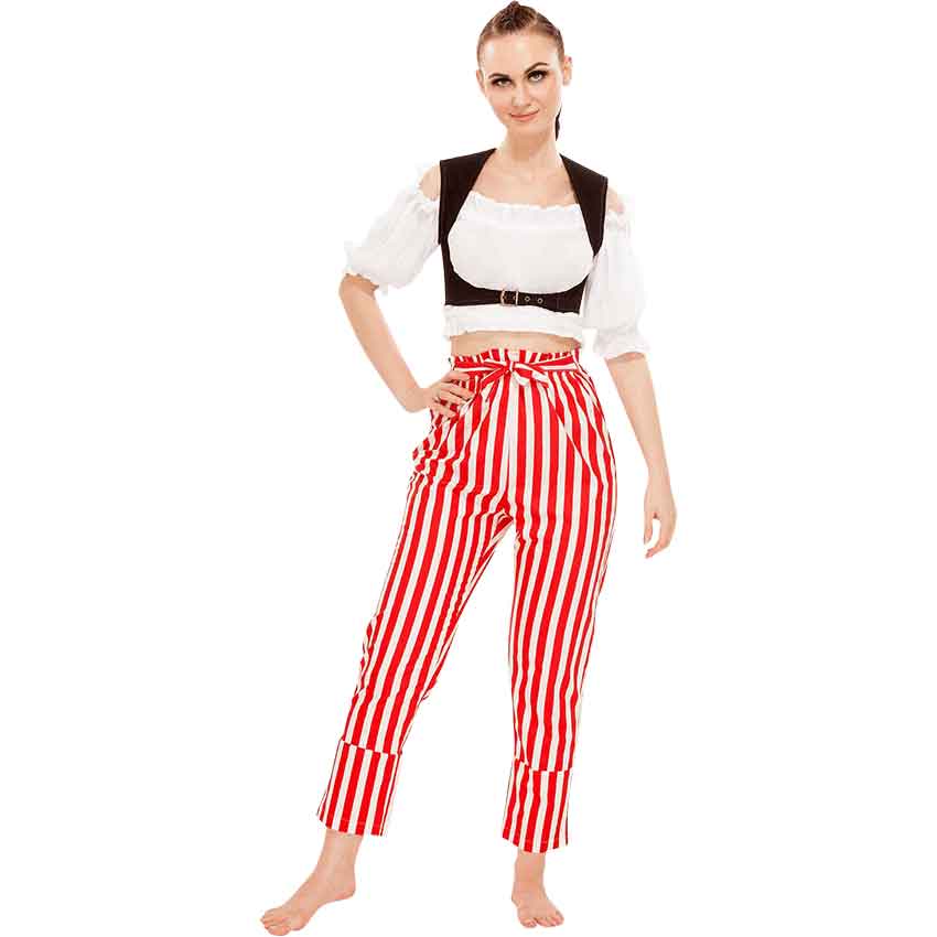 Swashbuckling sea captains and fearsome buccaneers require the proper attire. Make sure that you check out the Abigail Striped Pirate Pants. Made from 100 percent cotton, this pair of pants comes in a range of sizes. You can choose between three striped color options, such as red and black stripes. The pants have a waistband that ties in the front. The end of the pants falls around the ankle, depending on the height of the wearer. Just above the hem, the pants have a wide cuff on each pant leg. This cuff alternates its stripes compared to the rest of the pants. Their design makes them perfect for pirate-themed events such as faires and cosplay conventions.
