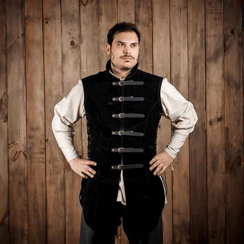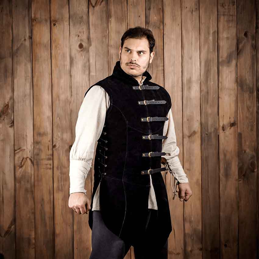 Introducing the Black Adrian Suede Leather Jerkin, a game-changing garment for those who seek authenticity and comfort in their persona portrayal. Crafted for connoisseurs, this jerkin is far from mere costume wear – it is a piece that elevates your experience, making every role more immersive.