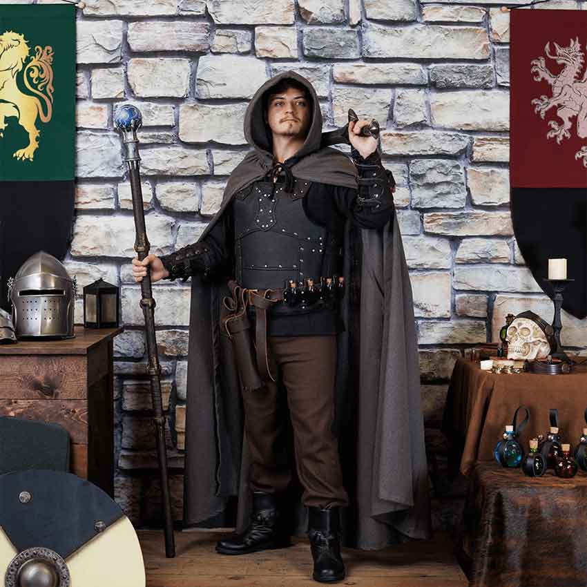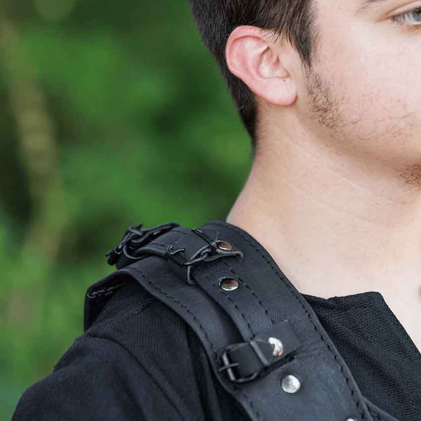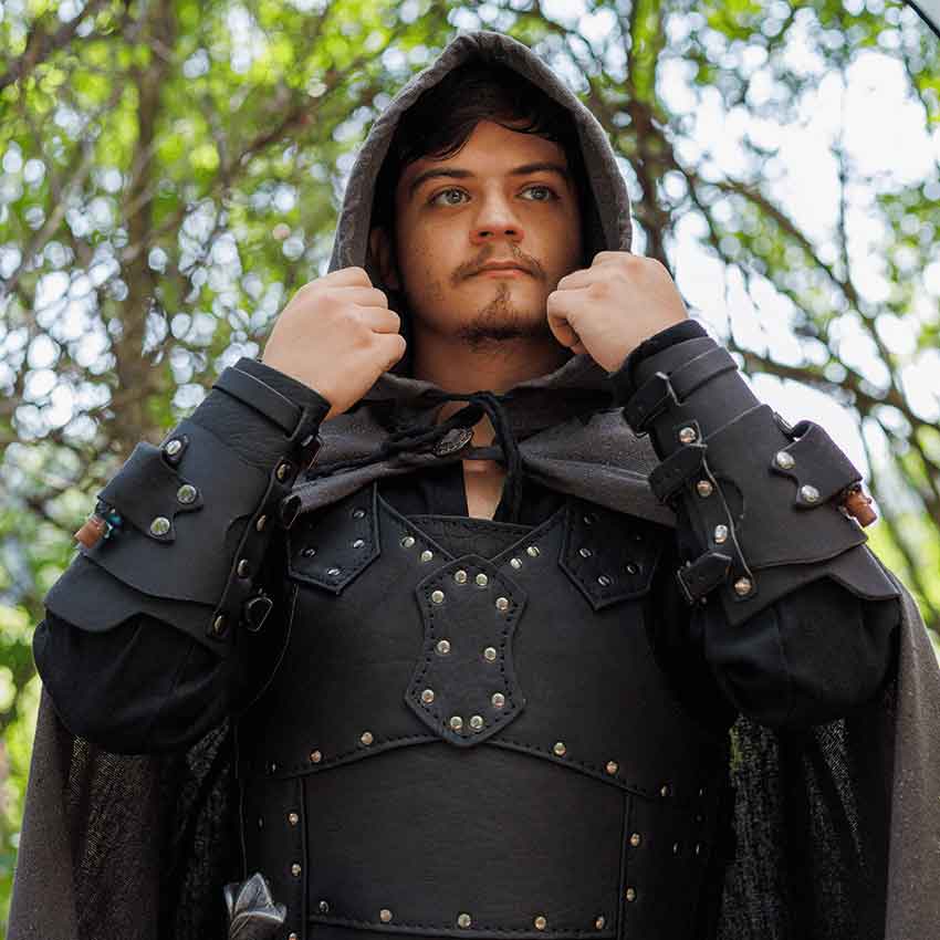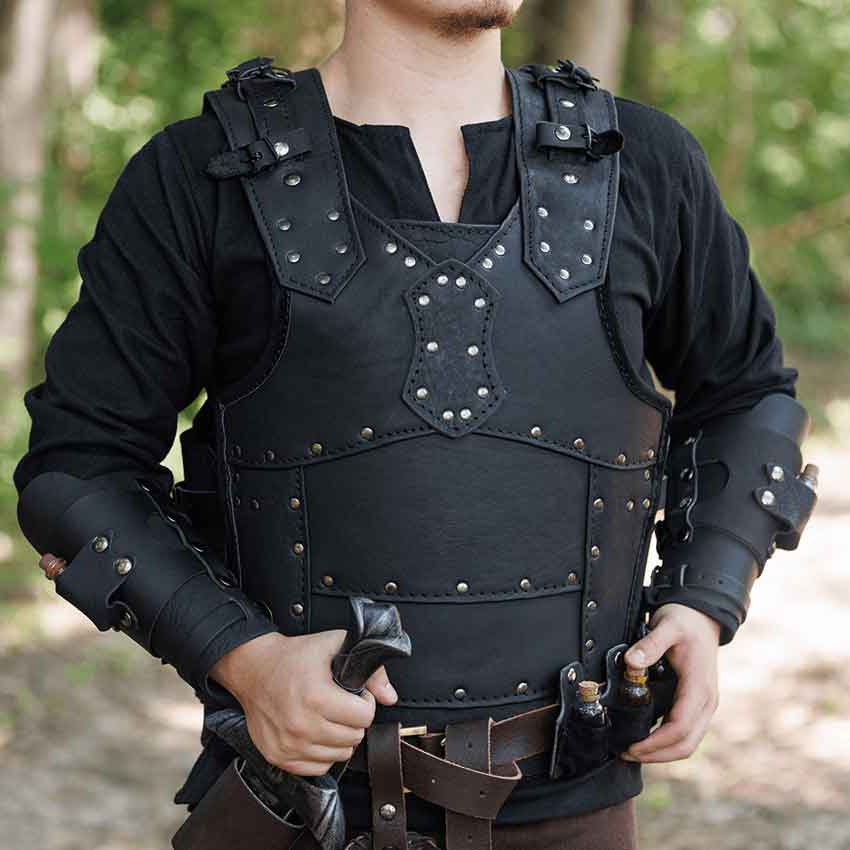 Made of natural, high-quality leather, the Albrecht Cuirass makes a statement with its detailed design and versatile style. Including both a breastplate and backplate attached with adjustable leather straps, wear this medieval armour for LARP and historical reenactments. The different segments of each plate are layered together and attached with metal grommets. With leather straps and buckles at the shoulder, the wearer can easily attach other pieces of armour to this leather cuirass, such as the Albrecht Spaulders (MY100249). Available in several classic colors.