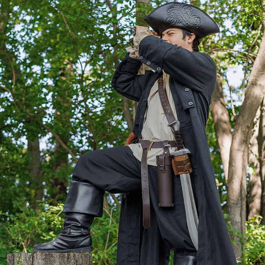 The Alrich Scroll Bag is a helpful accessory for those entrusted with the task of delivering important documents. Whether duty leads you to a battlefield or a scholarly setting, this case keeps urgent messages and sacred text close. The cylindrical bag is handmade from upper leather, which is soft and smooth in texture, yet extremely durable. It is dyed throughout so that it will keep its color even if the outer surface is scratched. Thick leather stitching reinforces the top and bottom of the scroll. An adjustable buckle strap secures the closure. The attached loop easily slides over a belt.