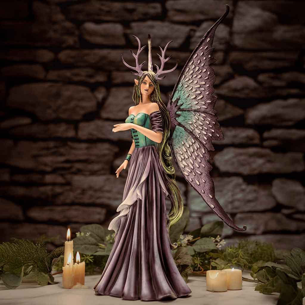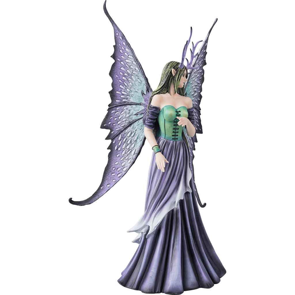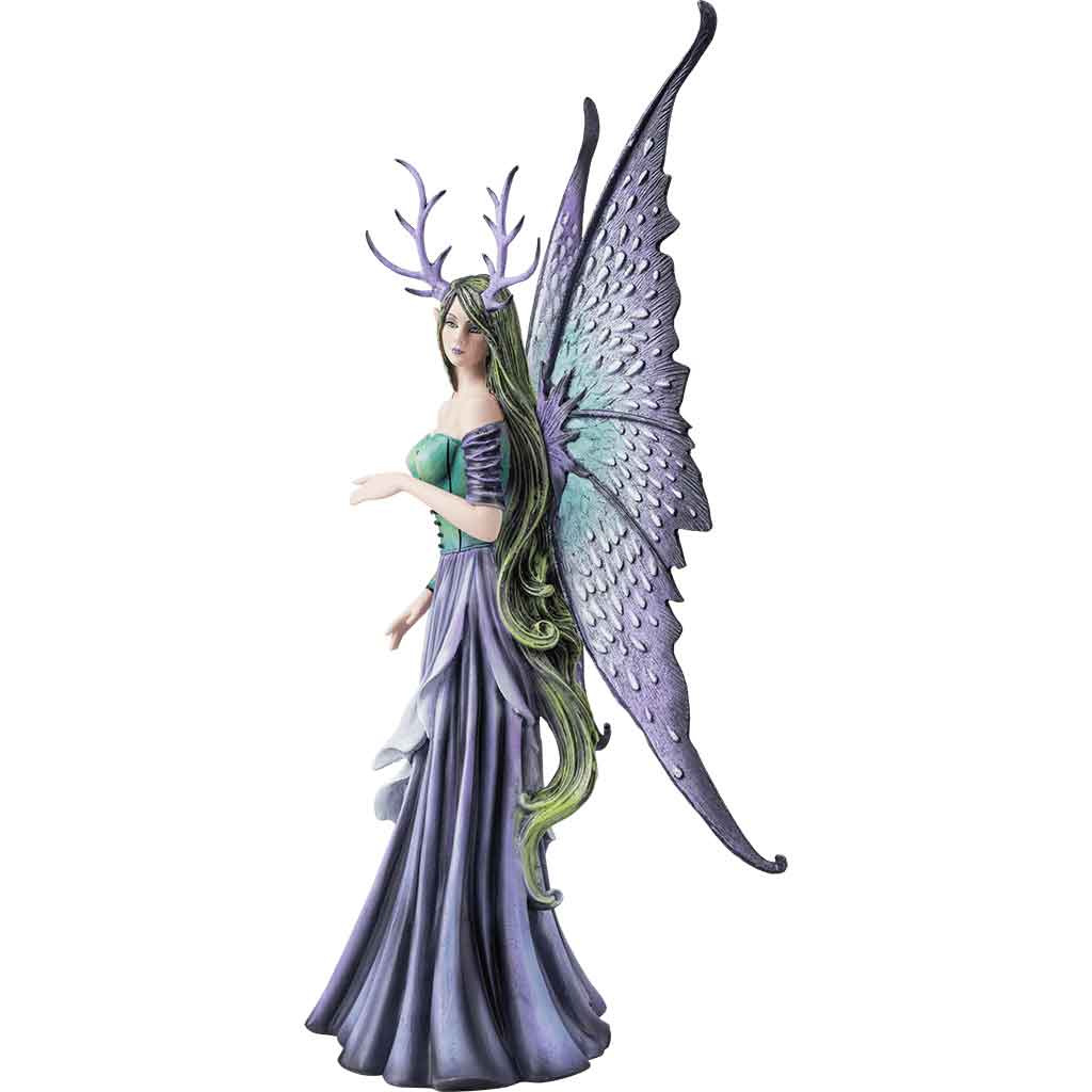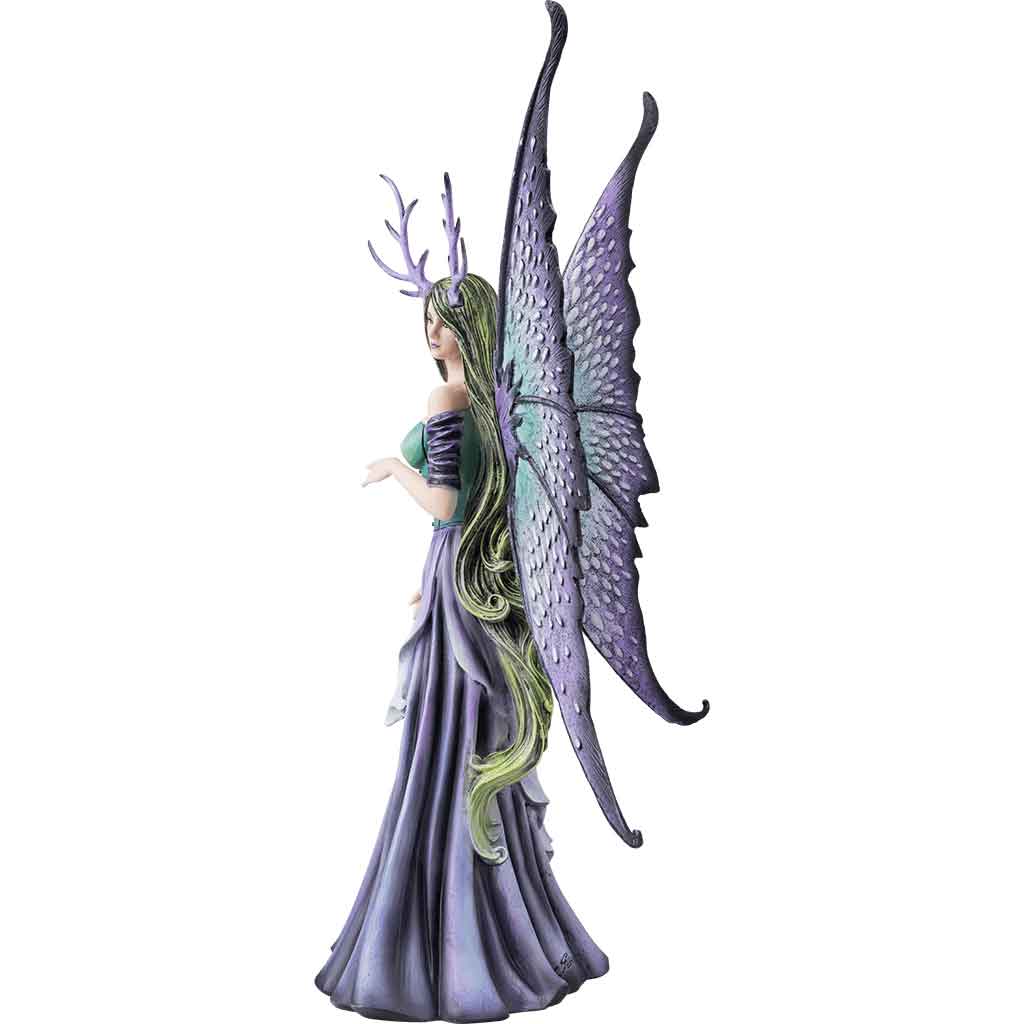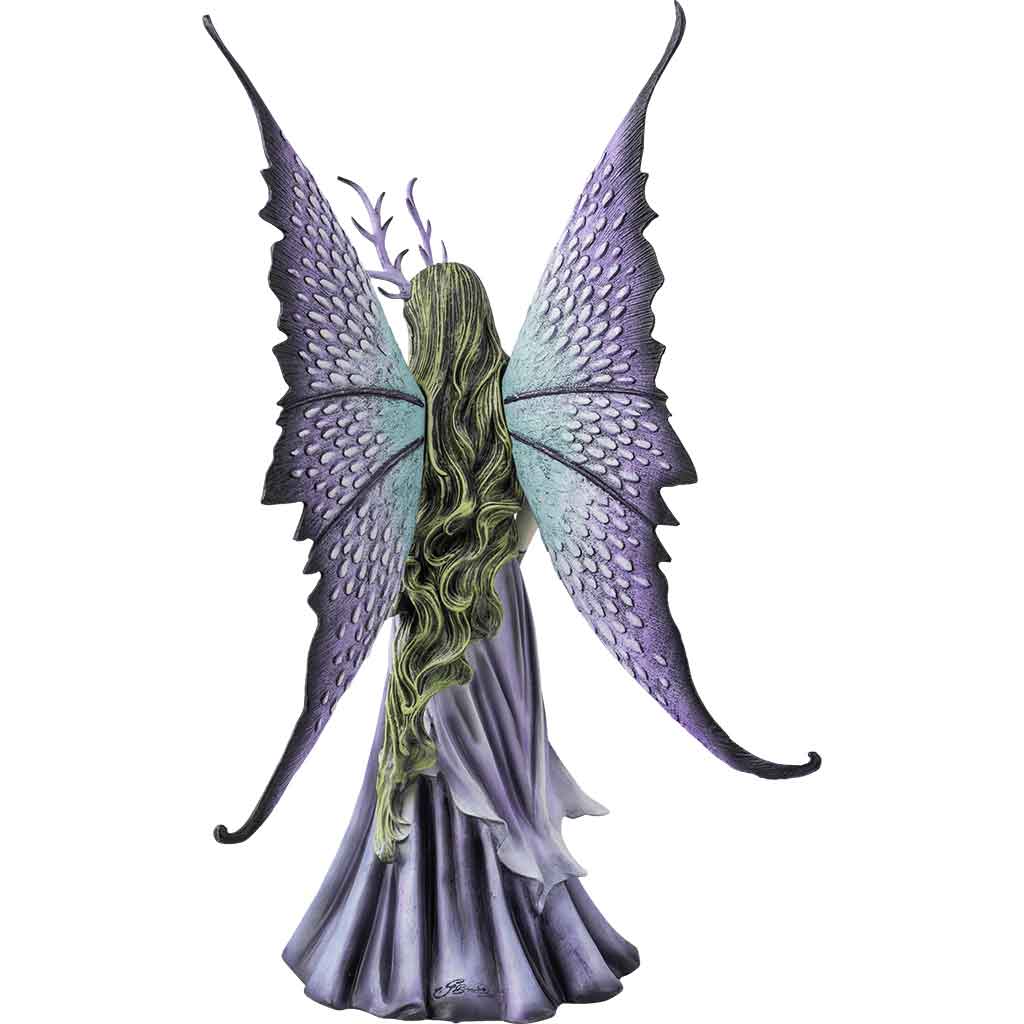 Next, the fairy has large butterfly wings that are blue-green at their bases and transition to dark purple at the tips. This fairy features green hair and purple antlers on her head. This Amy Brown fairy statue makes a great piece of fantasy decor or an addition to any fairy statue collection.