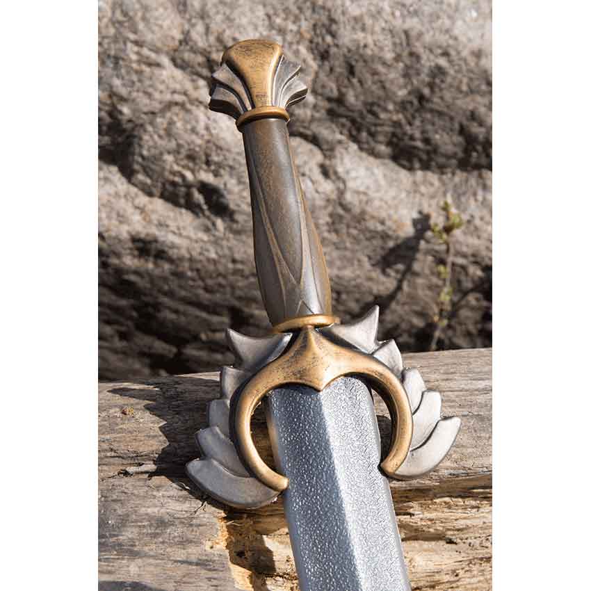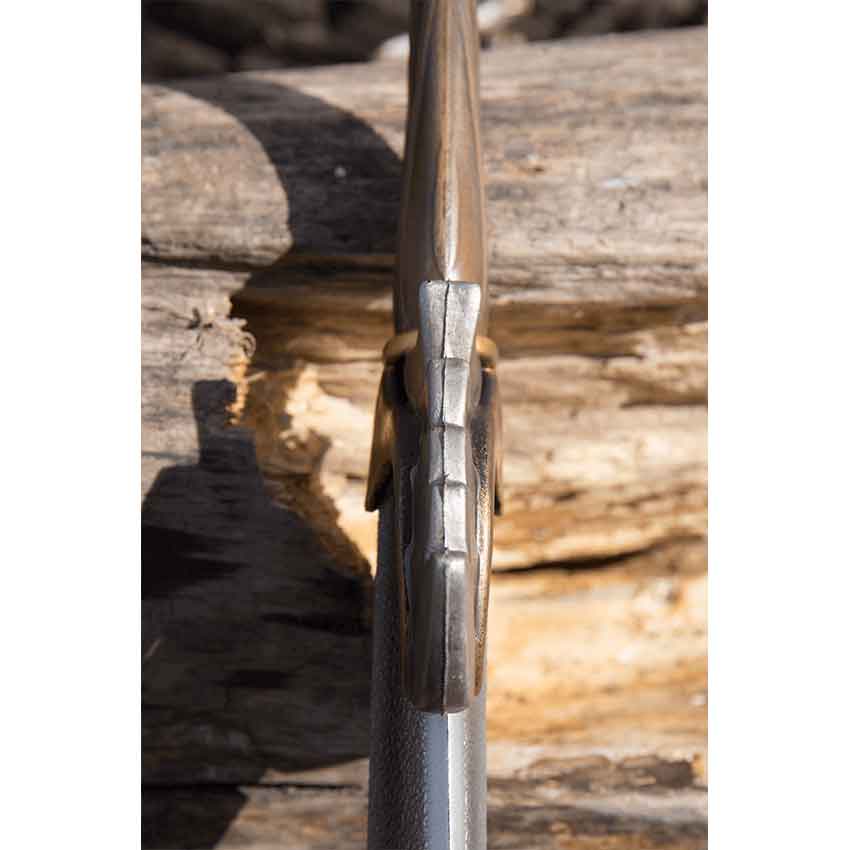 For holy warriors and those pure of heart, the Angelic LARP Sword is a worthy weapon. This fantasy LARP sword is made of Epic Foam in a latex-free construction, perfect for paladins, crusaders, and other divinely inspired fighters. The sturdy, innovative construction of this handcrafted LARP weapon makes it safe for tough battles as well as mostly maintenance free. Arched angel wings form the crossguard of the hilt, curling upwards towards the double sided, center ridged blade. Hand painted antique gold and silver tones decorate this crossguard and the matching pommel, and the sword handle has a realistic wood look and comfortably curved structure, assuring a firm and natural grip. Polyurethane cast construction allows for the excellent level of detail throughout the hilt. Whether you are a soldier on a divine quest or a heavenly being from the realms of fantasy, the Angelic LARP Sword is the perfect companion for live action roleplay adventuring.