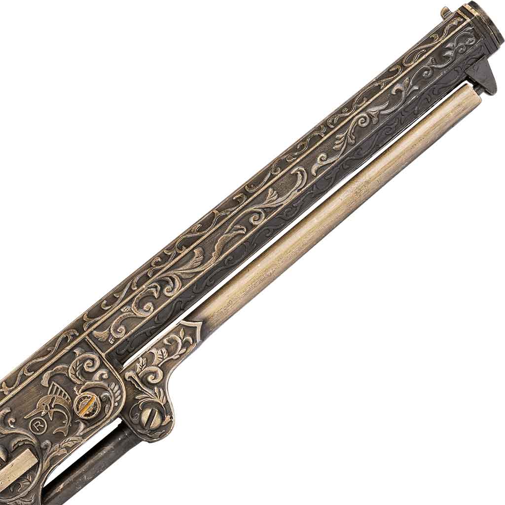 Based on the Colt Navy Revolver from 1851, the Antique Brass Revolver is a cap and ball revolver that has been heavily decorated, to the point that it appears more like some kind of military award than a pistol or replica firearm. The aged brass barrel and metal parts of this decorative pistol are covered in elegant, vine-like patterns. The US .36 has been engraved on the cylinder, referencing the original weapons country of origin and its caliber. The plastic handle of this replica pistol bears a redwood finish, complimenting the brass tones of the metal nicely. This firearm comes with a plastic display stand that allows you to place it in any room of your home as decoration. Give it as a gift, use it in your Civil War cosplay, or add this beautiful piece to your collection!
