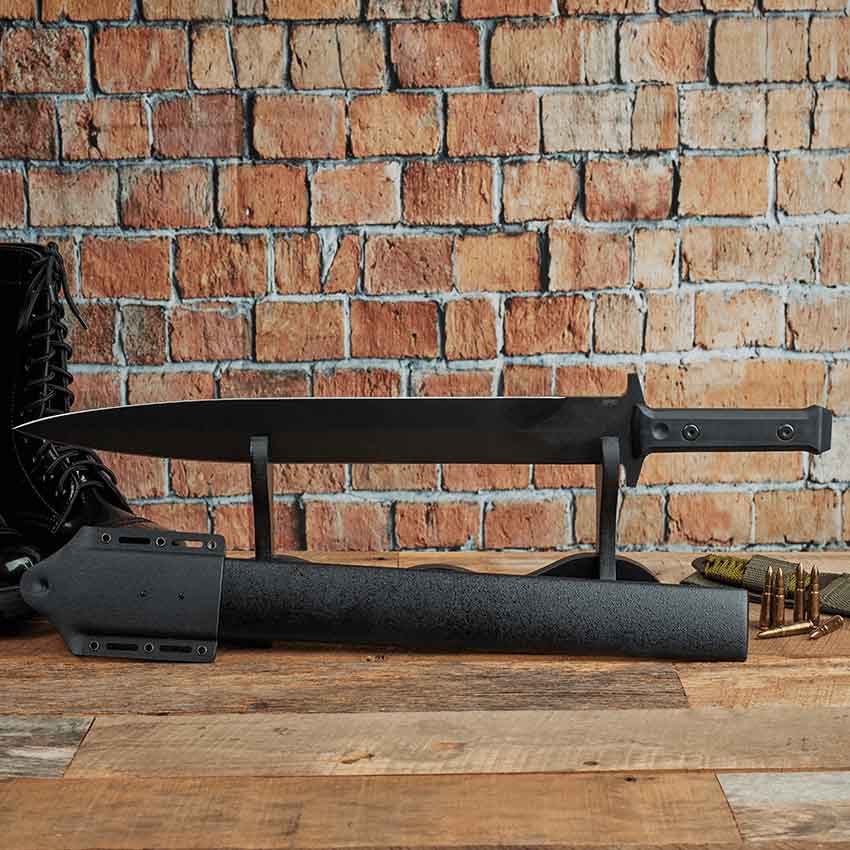 No matter if you are preparing for a zombie invasion or the end of the world, the APOC Brutus Tactical Sword makes a great sword to have on hand. Made from 9260 spring steel, this sword has a double-edged blade. Designed by Angus Trim, the black blade has a spearpoint tip. Its short ricasso acts as a crossguard. The blade design is great for cutting and thrusting. The full tang sword continues with a black, fiberglass handle. That G10 handle has straight sides along the grip and it flares out slightly at the end. Screws secure the grip in place. Finally, the APOC Brutus Tactical Sword comes with a black, Molle compatible sheath. This fully functional sword is a wonderful weapon to wield or add to a blade collection.