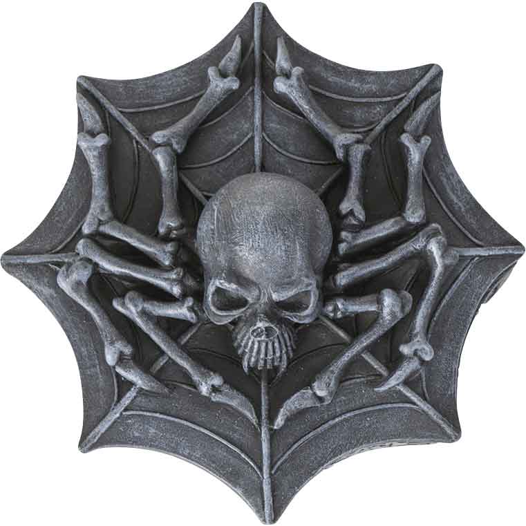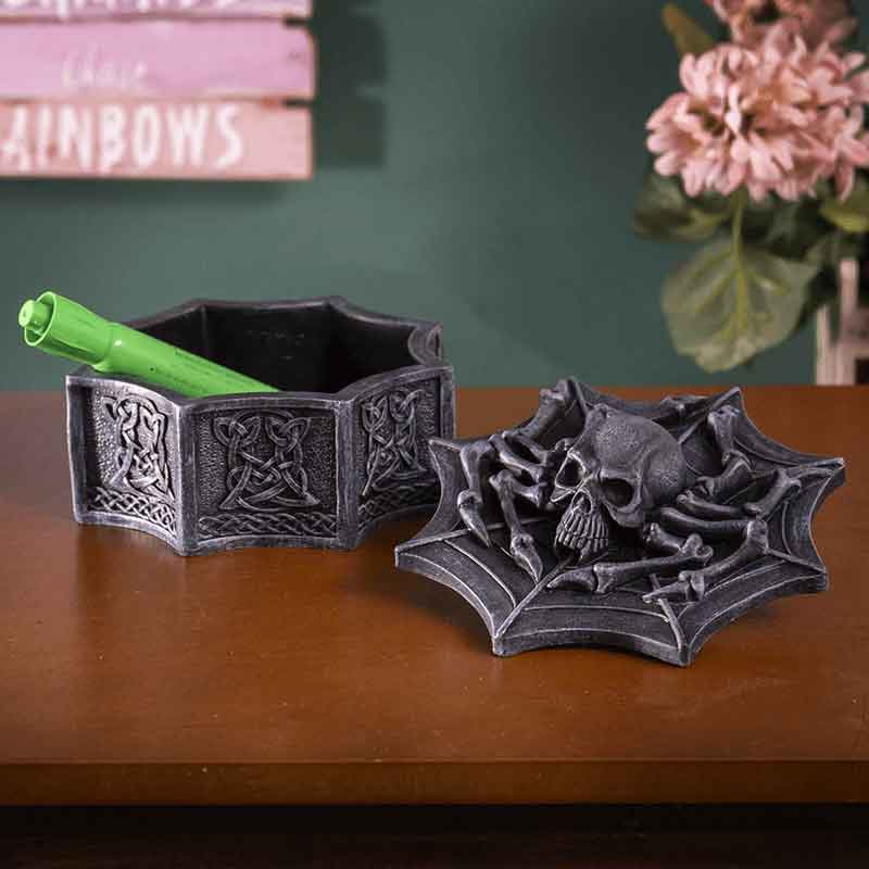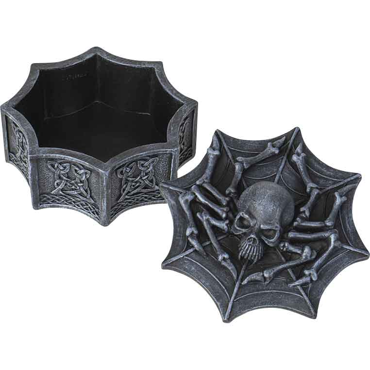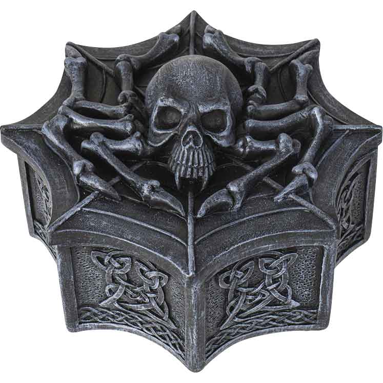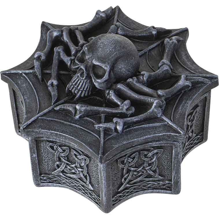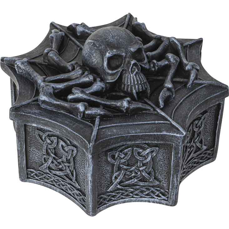 From Halloween to anytime of year, the Arachnid Skull Trinket Box is a great place to keep your small trinkets and treasures hidden away. Made from cold-cast resin, this gothic trinket box has a completely removable lid for easy access. Its lid takes the form of an eight-pointed spiderweb. Sitting on the web is a skeletal spider. The spider has boney legs, and its body is a fanged human skull. Knotwork covers the sides of the gothic spider box. The spider trinket box looks perfectly at home with any gothic home decor. You can also give this Celtic decor piece as a gift.