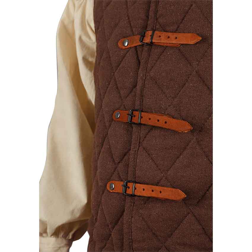 The ideal armour padding for your next re-enactment battle, the Arthur Long Gambeson extends from neck to knee. The top-stitched gambeson vest can be worn under many kinds of armour to help prevent rubbing and pinching. The tall collar increases comfort around the neck, as well. The long padded vest is stitched in a diamond pattern that allows movability and keeps the padding in place. The front of the medieval gambeson is fastened with four buckled straps. Metal eyelets run along the edges of the arm holes on the sleeveless gambeson, allowing the addition of sleeves (sold separately) if desired. This arming wear comes in black or brown color options.