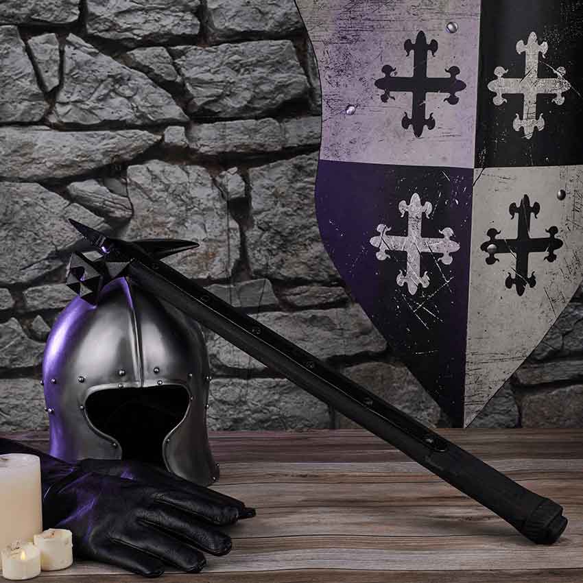 This war hammer is the real thing! The overall length is about 29 inches. The blackened iron hammer head and spike, hand wrought in iron, are mounted on a blackened and seared wood handle, creating a truly menacing weapon. It looks like it should be behind glass in a museum! This weapon was very effective against full armor.