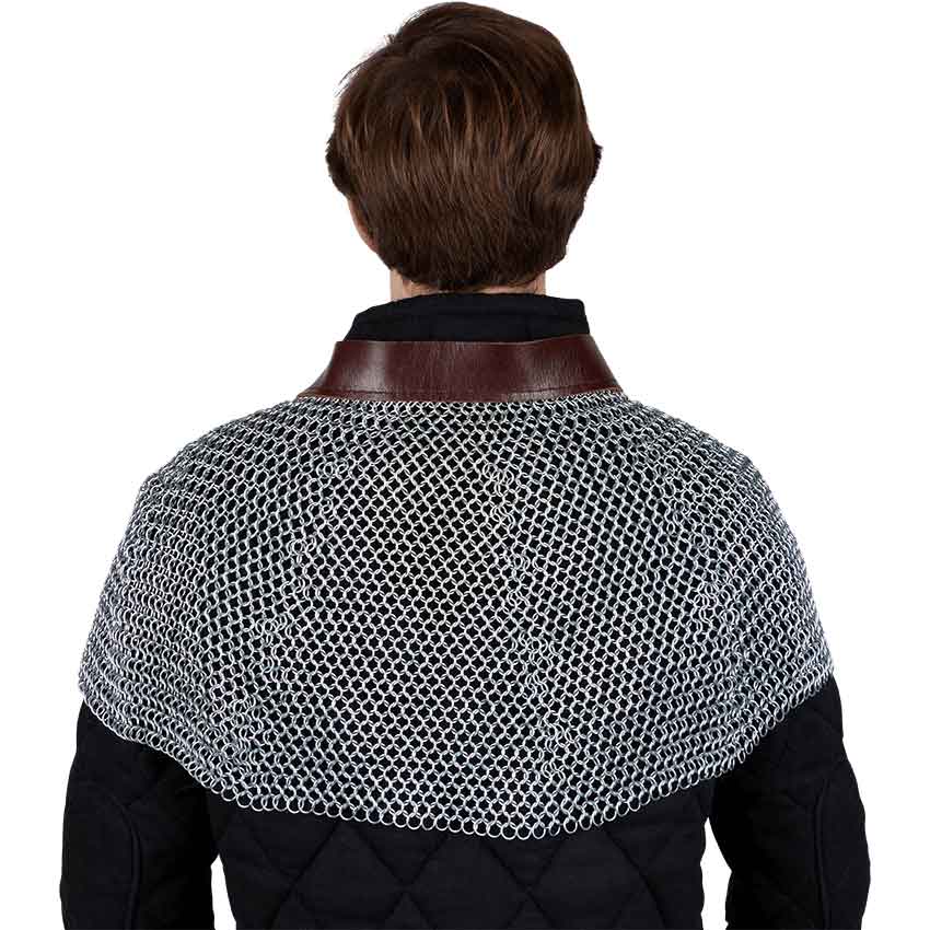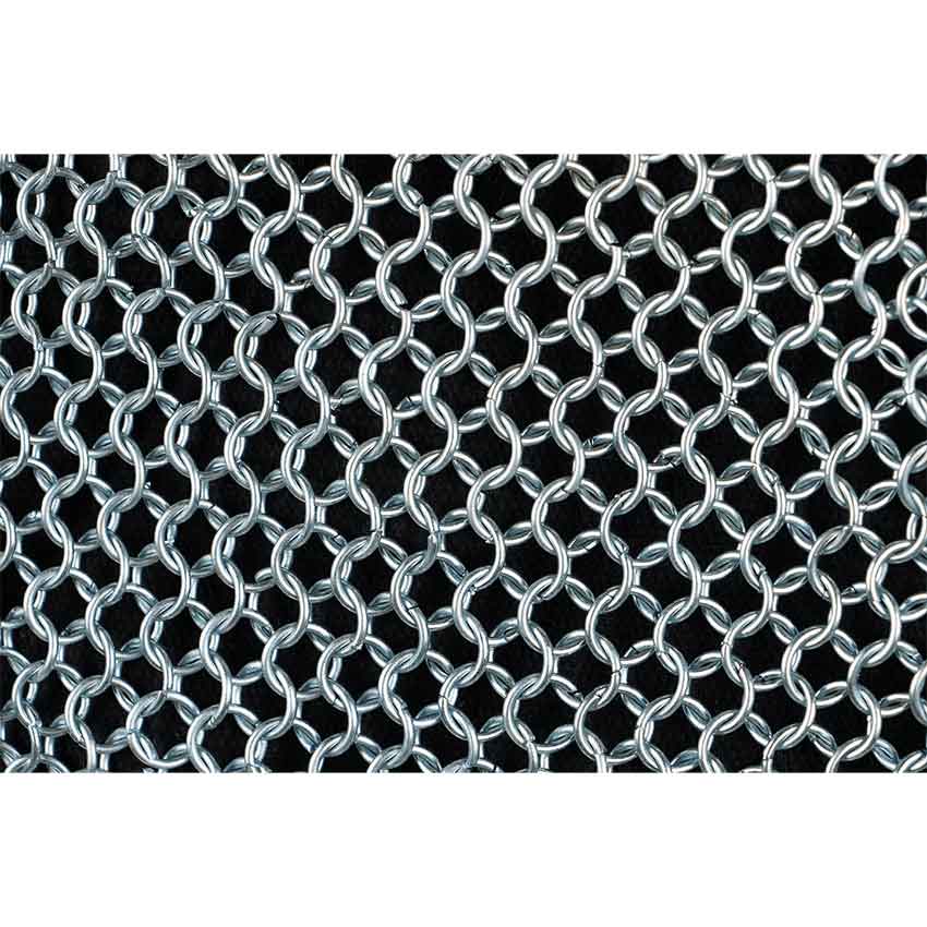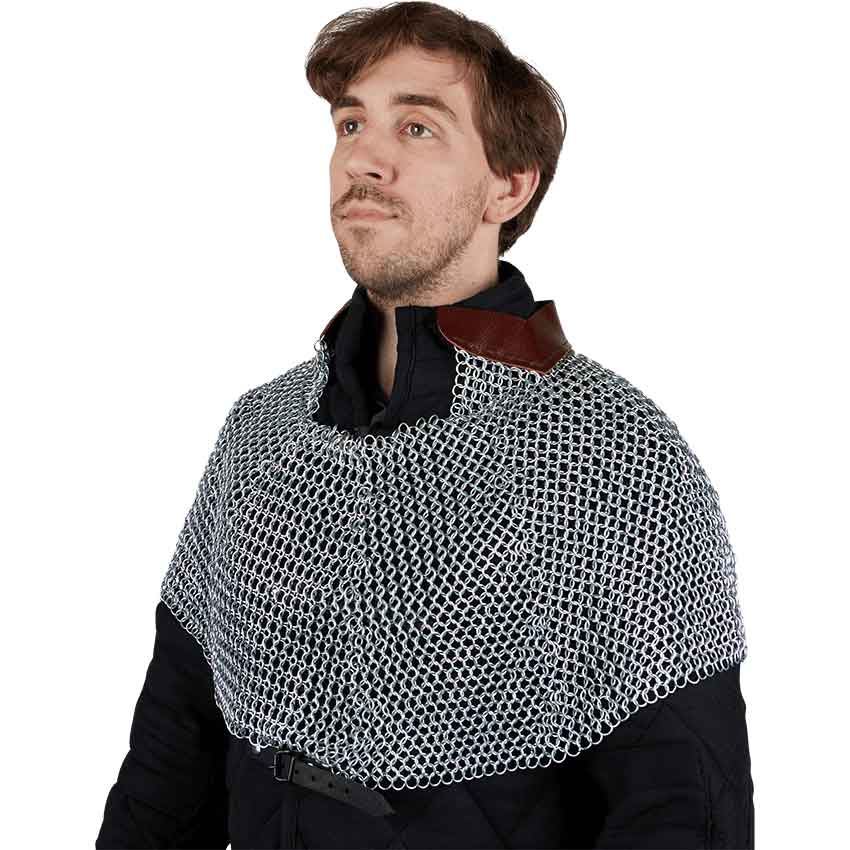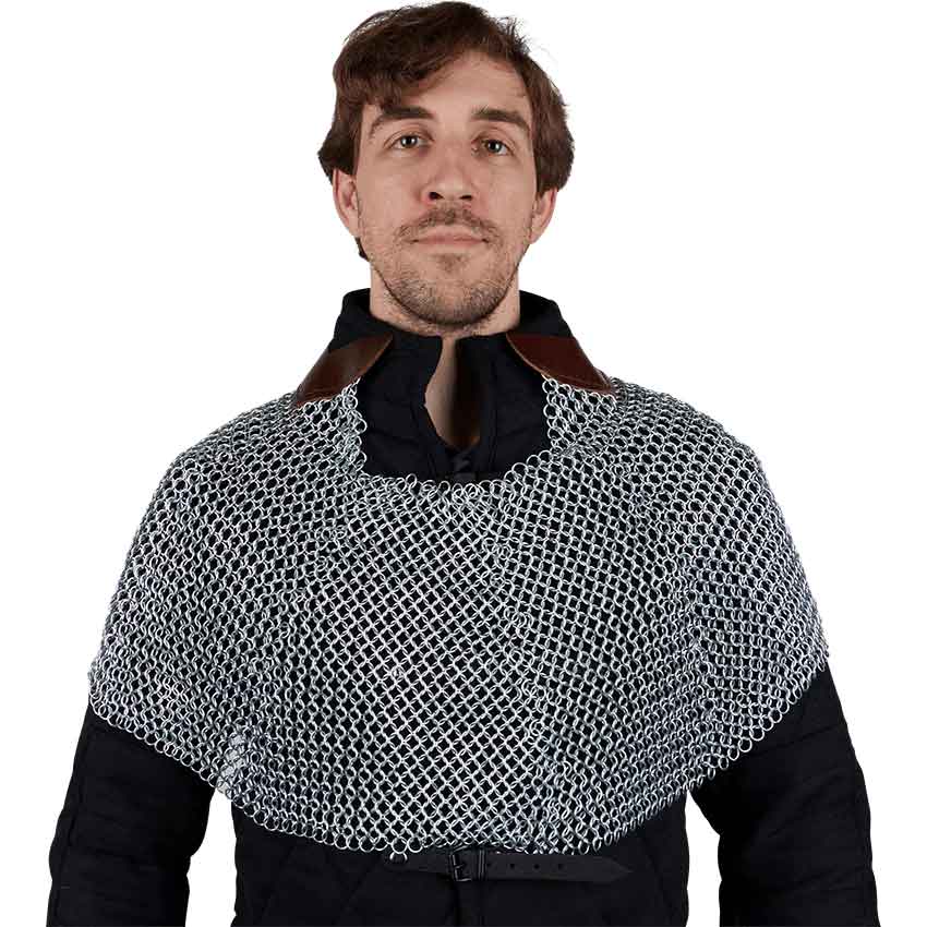 This chainmail mantle features a 4-in-1 pattern construction of butted round rings. A 4-in-1 pattern consists of four chainmail rings woven through another ring. The 8-millimeter rings have a zinc-plated finish. This aventail makes a great addition to any knights armour or medieval armour costume.
