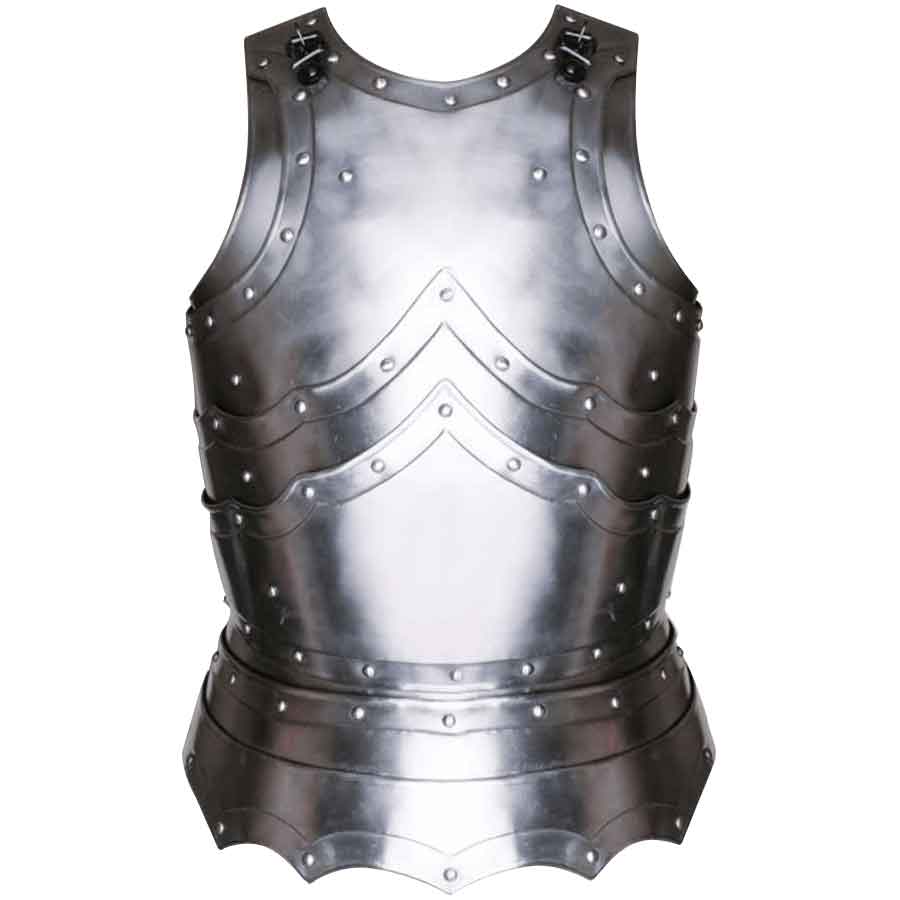 Next, the armour has a riveted design. The design has seven segments. For example, two of the segments form an inverted scallop along the center of the chest with a point in the middle. In addition, two other pieces form faulds. They are hinged, allowing for greater flexibility.