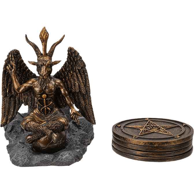 Made from cold-cast resin, this hand-painted occult coaster set includes a holder and four coasters. Each of the bronze coasters features the seal of Baphomet. Baphomet is a half-man, half-goat deity whose aspects focus on the duality of nature. The seal features a star filled in with Baphomets face with five characters at the points.