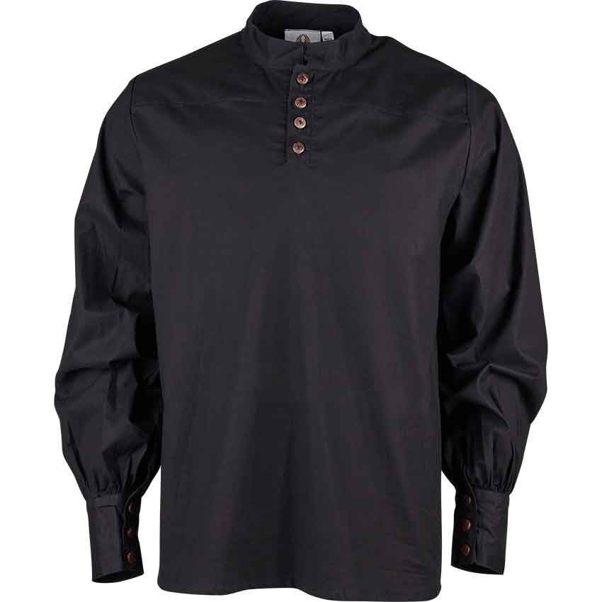 Starting from the top, this long-sleeve shirt has a classic cut and short stand-up collar. Below the collar are four vertically placed black buttons on the placket, made from natural coconut husk. This medieval shirt has square button cuffs at the end of its long, roomy sleeves. Those cuffs each have three black buttons made from natural coconut husk. These cuffs also gather the sleeves for a close fit that lets you flaunt your style without sacrificing practicality. Button up the collar or leave it open to express your unique style. Choose between three colors to fit your style: black for the roguish sellsword, cream for the noble traveler, or brown for the bold adventurer. Available in multiple sizes, you can choose the fit that best suits you.