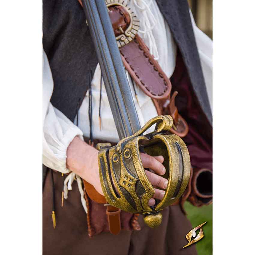 The basket-hilt design sets it apart. It features a raised golden pattern on a sleek black background, adding an air of regality to your ensemble. Crafted from reinforced foam, the intricately detailed basket hilt provides protection for your hand. It also enhances the sword’s overall balance, allowing for fluid movements during combat.
