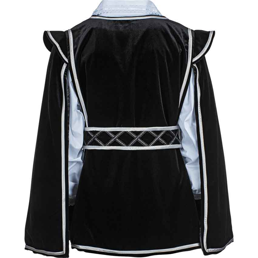 The Black and Silver French Styled Tabbard is an elegant garment that is quite reminiscent of the Musketeers. This attractive tabbard is made of high-quality velvet and is a great way to add a touch of obvious French style to your favored look. This garment consists of a single tunic-styled tabbard which is worn over the shoulders. It is decorated with laces and features a single metal cross on the center of the chest. The shoulders are subtly flared out and feature hanging full-length sleeves, which are open against the body, allowing for an exceedingly wide range of movement. This tabbard also features attractive silver trim across the whole garment, as well as a complete interior lining. Included with the tabbard is a stylish belt that is used for securing the tabbard around the waist. Please note that the pictured shirt, hat, and pants are not included with the tabbard, however. The Black and Silver French Styled Tabbard is almost uniquely identifiable thanks to its incredible French Styling. If you were looking execute your own self-styled musketeer-look with style and panache, then perhaps this is the garment to consider.