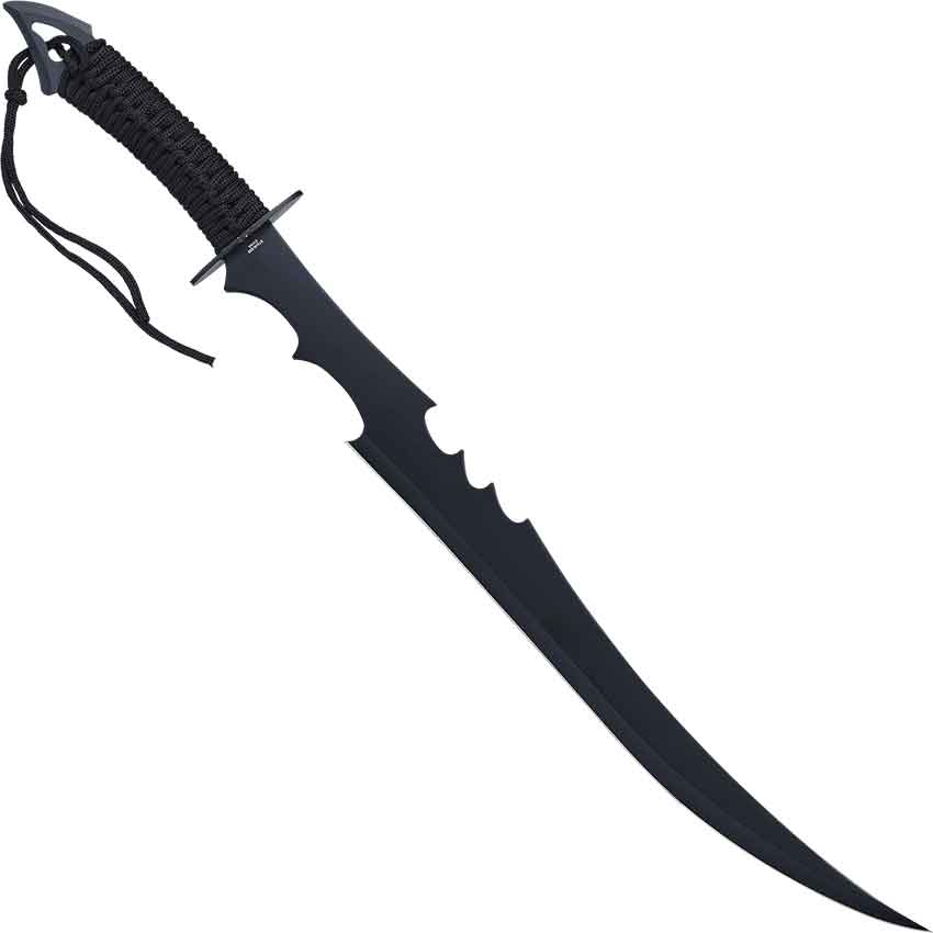 As paradoxical as it sounds, this Black Flame Warrior Sword is both complex and not, all at the same time. It features a straight-forward design that looks fit for combat, yet it also features a few extra touches that make it all the more appealing to see. This ensures that the sword is not only pleasing to the eye, but it is also fun and wicked to hold and handle. The sword features a blackened stainless steel blade that is decorated with a laser-etched red flame pattern near the hilt. It also features a unique shape, one that utilizes a wicked curve that terminates into a stabbing point that makes this blade look truly lethal. Rounded cut-outs on the front and back of the blade, just above the circular guard, also add a touch of distinctive style to the swords design. The grip is cord-wrapped for security, while the pommel is shaped into an arrow-like point that ensures even a stray pommel strike is capable of delivering deadly damage. Included with the sword is a black nylon sheath, which also features a shoulder strap that allows you to easily carry the sword along with you, if you so desire. For the warrior looking for that unique weapon that stands out in their hand and in their look, this Black Flame Warrior Sword is a great choice, as it not only has the look of a lethal combat weapon but also the stunning look of a decorative piece, too.
