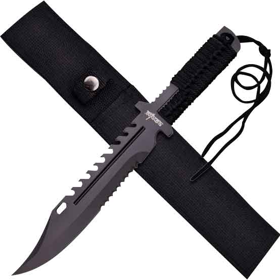 If you are deep behind enemy lines or in the wilderness trying to survive, the Black Survivor Battle Knife is ready to help. This versatile blade is sure to become a welcome tool as you overcome obstacles to ensure your survival. This fixed blade is crafted from stainless steel and then finished in black to reduce the shine and glare. The blade features 8.6 inches of half serrations so this knife can saw through anything. The 4.8 inch handle is wrapped in black cord to increase grip and also provide you with spare cord if the situation should call for it. When you are not utilizing this adaptable knife, you can comfortably carry it in the black nylon sheath that is included. The Black Survivor Battle Knife can be the tool that means life or death in a worst case scenario, so grab one today.