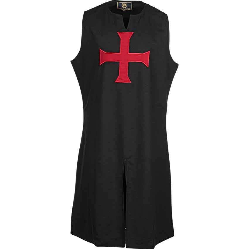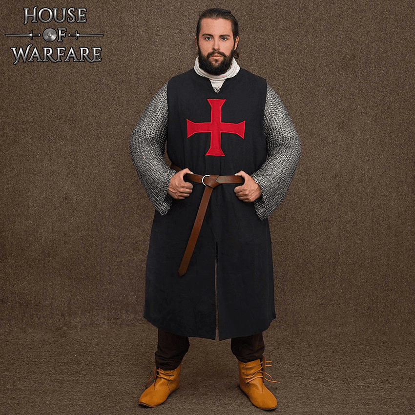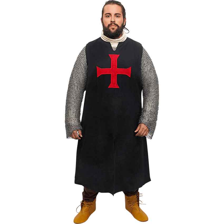 You hear the trumpet sound, calling you and your men into battle. The Black Templar Tunic with Red Cross reveals to all your loyalties. Made from cotton, this Crusader tunic comes in three sizes. The black tunic is sleeveless and has a V-cut neckline. It has a slit at the center of the hem in the front and back. This hem helps to provide the wearer with greater mobility. The hem ends around the knee, depending on the height of the wearer. At the center of the chest, there is a red Templar cross. This design is typical of a Crusader knight, perfect for characters from this era. Wear this black Templar tunic to your next medieval LARP event or historical reenactment.