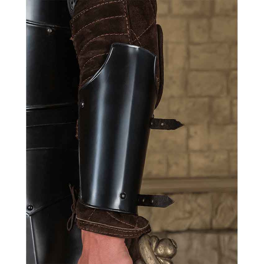 Warriors who want a function and form in their plate armour are sure to be impressed by the Blackened Markward Bracers. The steel bracers feature a central bend running down the front, adding strength and stiffness to the design. The striking arm armour shows off a dark metal finish that goes especially well with other pieces of our Markward-style armour. The sloped sides of the top add a touch of elegance to the plate armour, giving it a unique look. When planning your LARP or re-enactment ensemble, make sure to consider these excellent metal bracers. We recommend wearing padded arming wear underneath for increased comfort.
