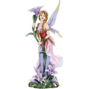 Different fairies tend to different flowers. In the Blooming Lily Fairy Statue, a fairy is tending to lily blossoms and making sure the flowers bloom. This cold cast resin statue depicts a fairy wearing a red petal dress. She has purple stockings and matching yellow tipped wings. She is holding onto a tall flower while shorter purple lilies decorate the base around her feet. This beautiful, hand-painted statue makes a fantastic home decor piece for fairy enthusiasts.