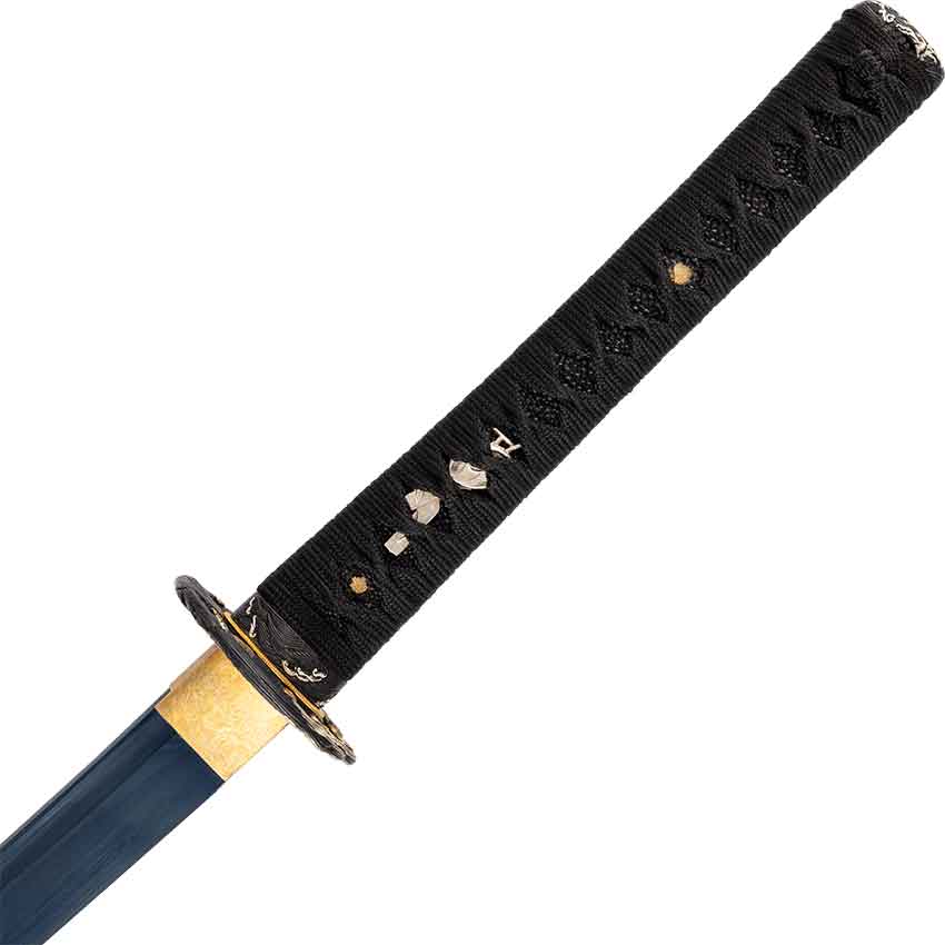 Forged from T10 high-carbon steel with a titanium coating, this handmade katana shows off a traditional craftsmanship dating back millennia. Carbon steel is renowned for its durability and titanium is an exceptionally strong metal. This katana, also known as a Japanese longsword, can be wielded with one or both hands. The sharpened blade is slightly curved like true uchigatana from feudal Japanese history. The uchigatana is another traditional term for describing a slightly curved Japanese katana. Like the legendary tsunami, this katana has a blue blade for added style.