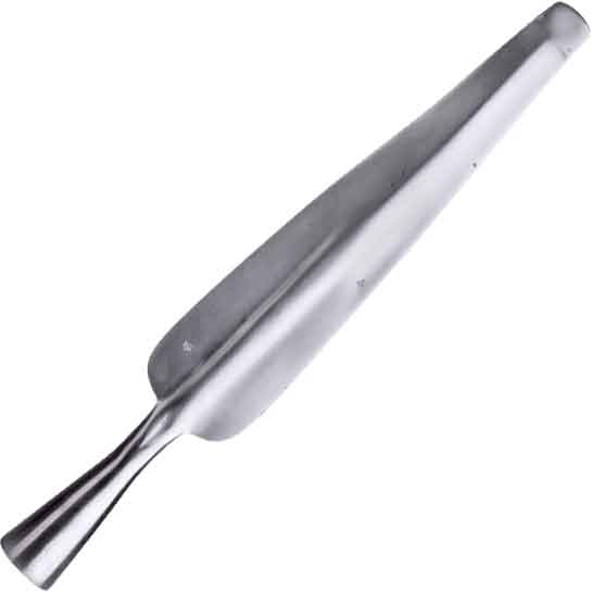 You, mighty warrior, enjoy creating your own weapon, whether for a costume or stage fight. Check out the Blunt Tip European Spearhead. Made from carbon steel, this functional spearhead has a thick, blunt tip for safety. It features a wide, leaf-shaped blade. There is a long ridge down the center of the blade. At the base of the blade, there is a socket for attaching it to a shaft, not included. In addition, the socket has a slit down the side which allows it to fit better on a shaft. This spearhead is a great item for DIY projects, reenactments, or displays. It is also a wonderful collectible piece.