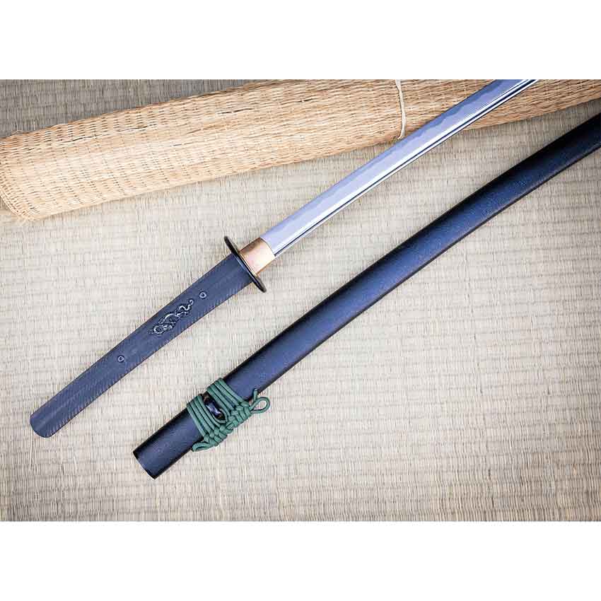 - Secure Saya Scabbard: Sheathe the blade in the black fiberglass scabbard.