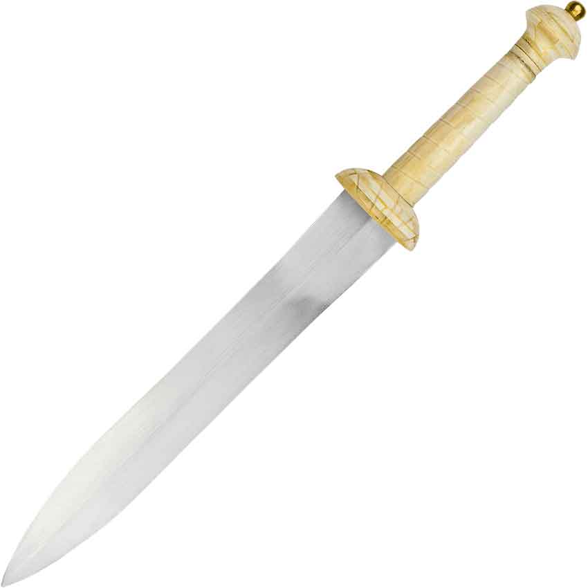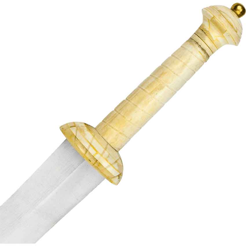 Perfectly suited to the brutal combat of the gladiatorial arenas, short stabbing weapons like this Bone Handled Gladiator Dolch were used by many a Roman gladiator. And as weapons, they also helped to ensure an exciting match for the spectators, too. By intentional design, the blade is left shorter than the average Roman gladius, which helped to make it easier to handle in untrained hands, while also ensuring the gladiators had to be much closer in fights (which made for a more exciting bout, to be sure). This short sword features a solid bone hilt with narrow groves to provide a solid grip, as well as a cup shaped guard for a modicum of defense when wielded. The blade is made from EN45 high-carbon steel and has been left unsharpened. The blade features a subtle leaf-blade shape, curving outwards slightly towards the tip before tapering into a sharp point, allowing it to deliver effective hacking and chopping blows as well as deadly thrusts. As gladiators typically carried their weapons into the arena, this sword lacks a scabbard or sheath of any kind. By no means was this the only weapon used by gladiators, but swords like this Bone Handled Gladiator Dolch were by the far the most common weapons used by gladiators, making them a great choice to add to any Roman gladiator ensemble, as well as a great display piece to include in your own décor or collection.