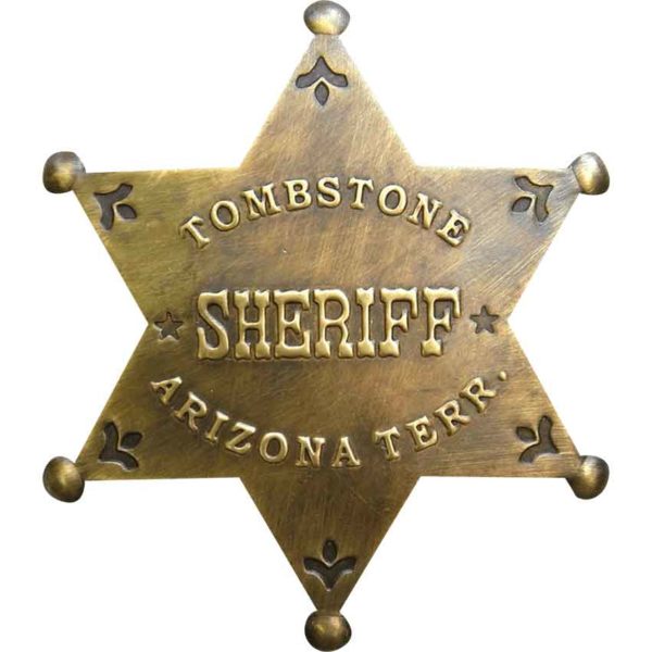 Tombstone, Arizona was one of the last wide-open frontier boomtowns and the setting for the well-known Gunfight at the O.K. Corral. The Brass Tombstone Sheriff Badge allows you to own some of those memories of American culture. This badge takes the classic six-point star shape, with each point featuring a rounded edge. It also features decorations around the edge, as well as the words SHERIFF TOMBSTONE ARIZONA TERR. written in raised lettering through the center of the badge. This brass badge has been given an antique finish. A soldered pin ensures this badge can be either displayed or easily worn. The Brass Tombstone Sheriff Badge makes a great addition to any western badge collection.