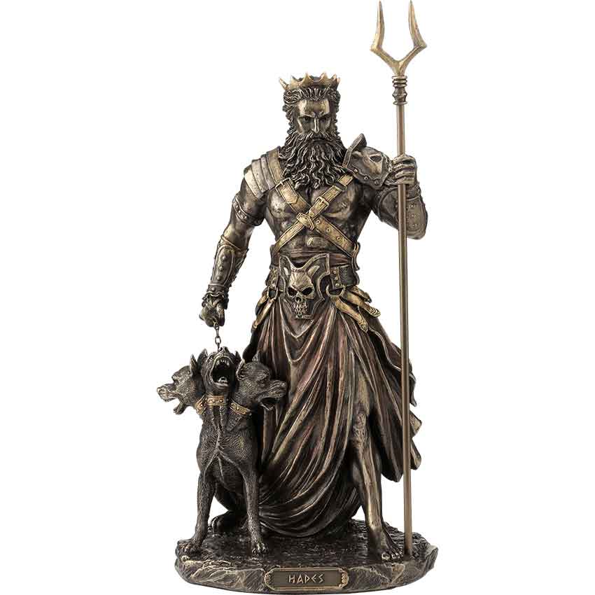 In Greek mythology, the Land of the Dead is ruled by the stern and powerful Hades, who is often seen with his three-headed watchdog Cerberus. The Bronze Hades Statue depicts this mighty Greek god and his pet in lifelike detail. This bronze figurine, which has been given a polished finish, portrays Hades standing in a formidable pose, his classic bident in his left hand. His long beard flows down his face onto his armoured shoulders. A red battle skirt billows about his legs, held to his body by way of a belt that depicts a demonic skull. In his right hand, he holds the chain that binds his dog, its three mouths open in a silent snarl. The Bronze Hades Statue makes a fantastic piece of home decor that is perfect for any lover of Greek mythology.