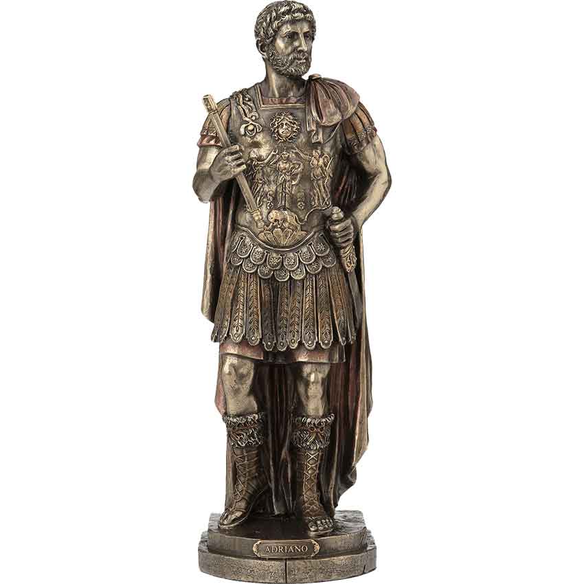 The Roman emperor Hadrian was known for his love of traveling and his benevolent reign, earning him a place among the Five Good Emperors. You can pay homage to this gracious ruler when you put the Bronze Hadrian Statue on display. This bronze figurine portrays Hadrian, called Adriano in his native tongue, standing in ornamental armour. His calm face is framed by his curled hair and beard, and a long, red-colored cape is draped over his shoulder. In one hand, he holds a scroll, and the other is placed on the gladius holstered at his hip. The Bronze Hadrian Statue makes a fantastic piece of Roman home decor and is sure to please any history buff.
