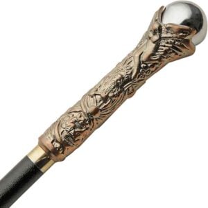 The spellbinding charm of this cane does not stop at its concealed blade. The handle itself is a masterpiece, crowned with a silver-colored ball encased in a highly detailed, bronze-finished section. This captivating design culminates in the image of a wizard casting magic, a homage to the legendary Merlin himself. The intricate details and the bronze finish on the handle serve not only as a testament to the canes mesmerizing aesthetics but also to the craftsmanship and artistry that bring this fantasy to life.Beyond its decorative flair, the Bronze Merlin Sword Cane is a versatile addition to any wardrobe. Whether you are embodying a character in a cosplay, accessorizing for a themed event, or simply adding a touch of mystery to your everyday ensemble, this sword cane adapts seamlessly. It is the ultimate accessory for cosplayers, collectors, and connoisseurs of fantasy, offering an unmatched blend of style and narrative depth.