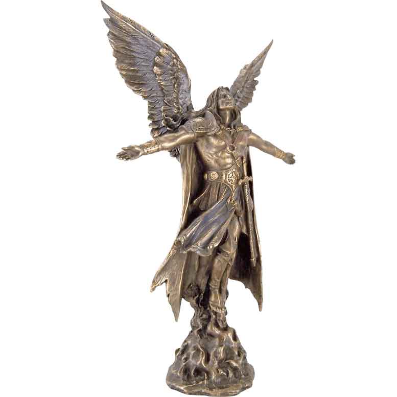 Designed to appear as an angelic warrior who is ascending the mortal plane, the Bronzed Ascending Angel Statue is a wonderful home accent and an eye-catching means of incorporating a touch of your faith into your decor. With a look of peaceful bliss upon his face, this angel spreads his arms to embrace exaltation. He is depicted wearing ornate armor with a sheathed sword on his belt, and his garments sway gently in the breeze as he begins his ascent. Below him, the ground is fiercely burning in the fiery cleansing purge the final days. To achieve an elegant and highly detailed design, this statue is hand crafted from cold cast bronze. Always be reminded of your faith by displaying the Bronzed Ascending Angel Statue.