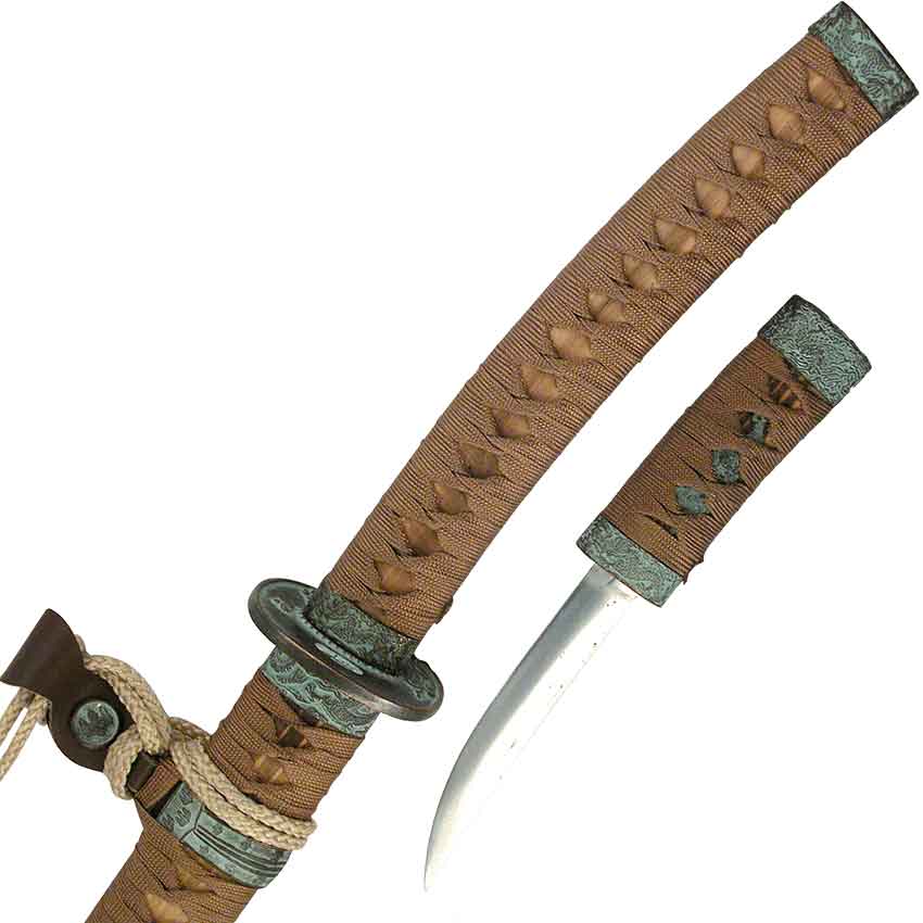 Looking for a Japanese sword with a unique appearance? If so, you should make sure to check out the Brown Jintachi with Hidden Tanto. Made from stainless steel, this decorative blade features the traditionally curved shape found on many Japanese swords. The sword continues with an antique-bronze tsuba. The patinaed tsuba has an animal design. Then, the hilt has a curved handle with a brown cord wrapping. It also features antique-bronze fittings. A tanto with the same handle design hides in the end of the jintachis handle. This makes the handle of the jintachi look longer with the tanto inside. Finally, this sword comes with a wooden scabbard. The scabbard has a natural finish and brown cord wrapping. It also features a cord and leather carrying handle. This sword makes an ideal showpiece for any weaponry collection or Japanese-inspired home decor.