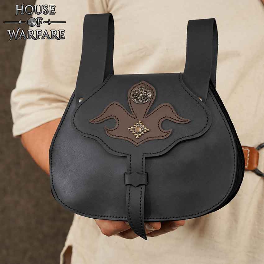 On the front flap of the Celtic belt bag, there is a brown leather accent. It has a stylized, fleur-de-lis shape. At its center, there is an antiqued, diamond-shaped accent. Above it, there is a circular accent with a knotwork pattern.