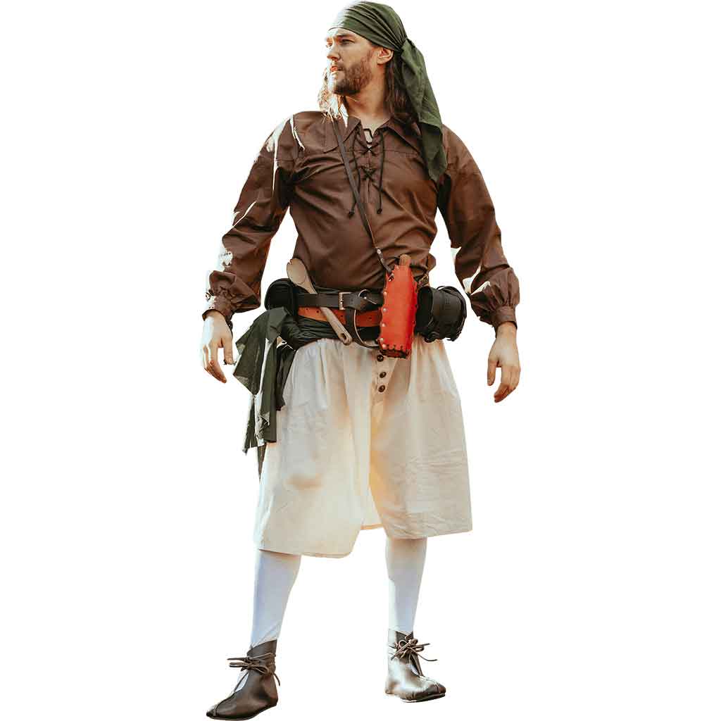Sailors, pirates, corsairs, and seafarers alike know that a great outfit not only looks fantastic, it also helps make their next adventure unforgettable. Included in this pirate outfit bundle are two basic layers, perfect for getting your journey in the age of pirates started. Wear the Sawyer Light Cotton Shirt with the Matey Cotton Pirate Pants as you set sail for new lands to plunder. Genteel, yet understated, the Sawyer shirt lends your look a hint of rugged style and sophistication in equal measure. Both the shirt and the pants are available in a variety of sizes and colors, letting you mix and match to bring out the best of your outfit.