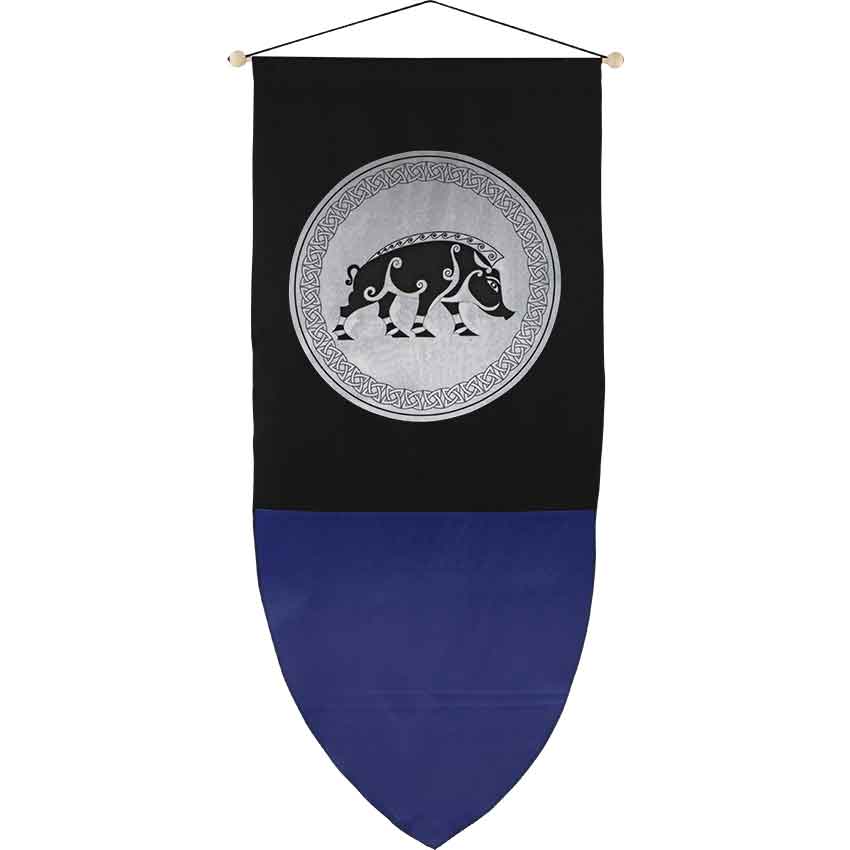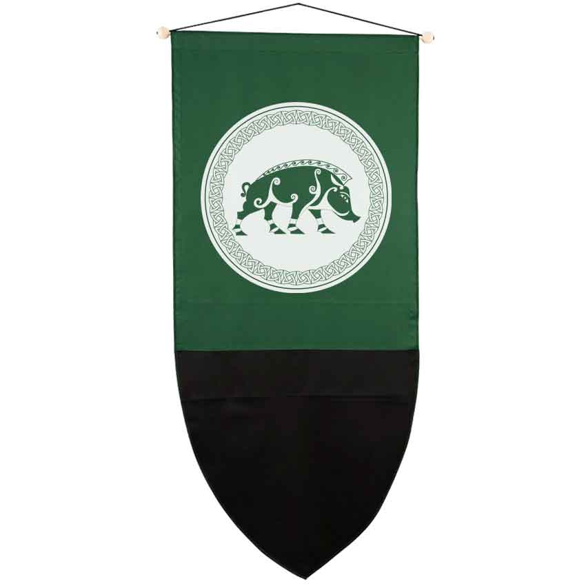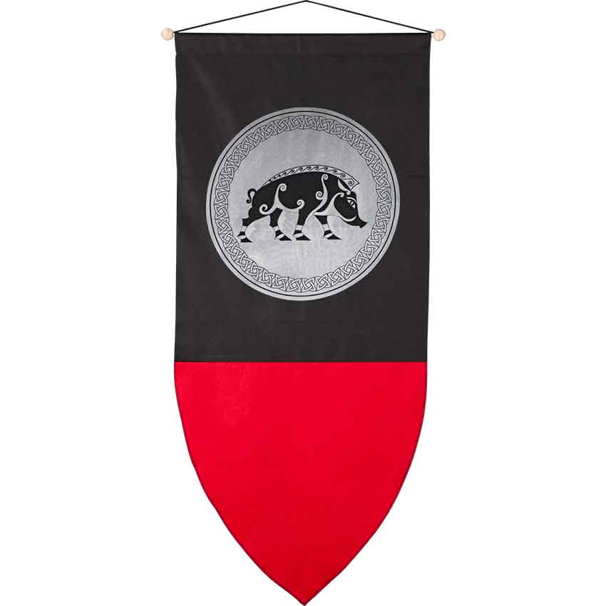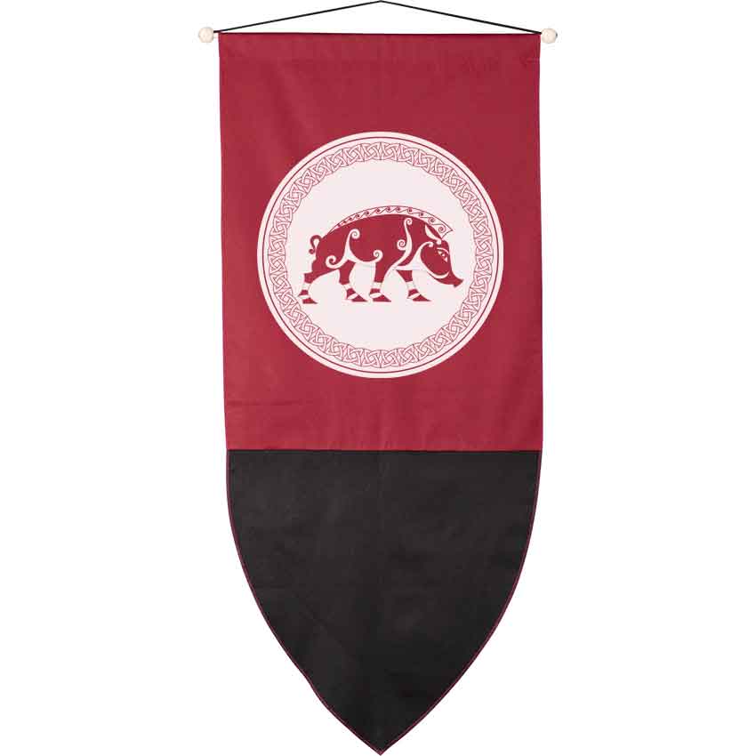 Also, this Celtic standard has a two-color design. For the color options, the first color listed is the color of the top part of the banner. The second color listed is the color for the bottom of the banner. This Celtic banner comes ready to hang with a natural-colored wooden rod and black cotton string already attached. Nearly four feet high, this banner is intended for indoor use, but can also be temporarily displayed outside in nice weather. The Celtic Boar Banner adds some great style to any decor. Hang it up in your home or office. You can add it to a faire tent or reenactment display.