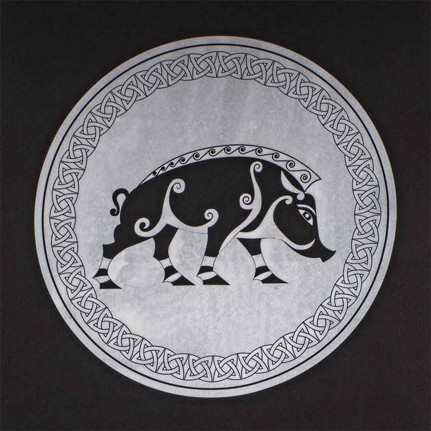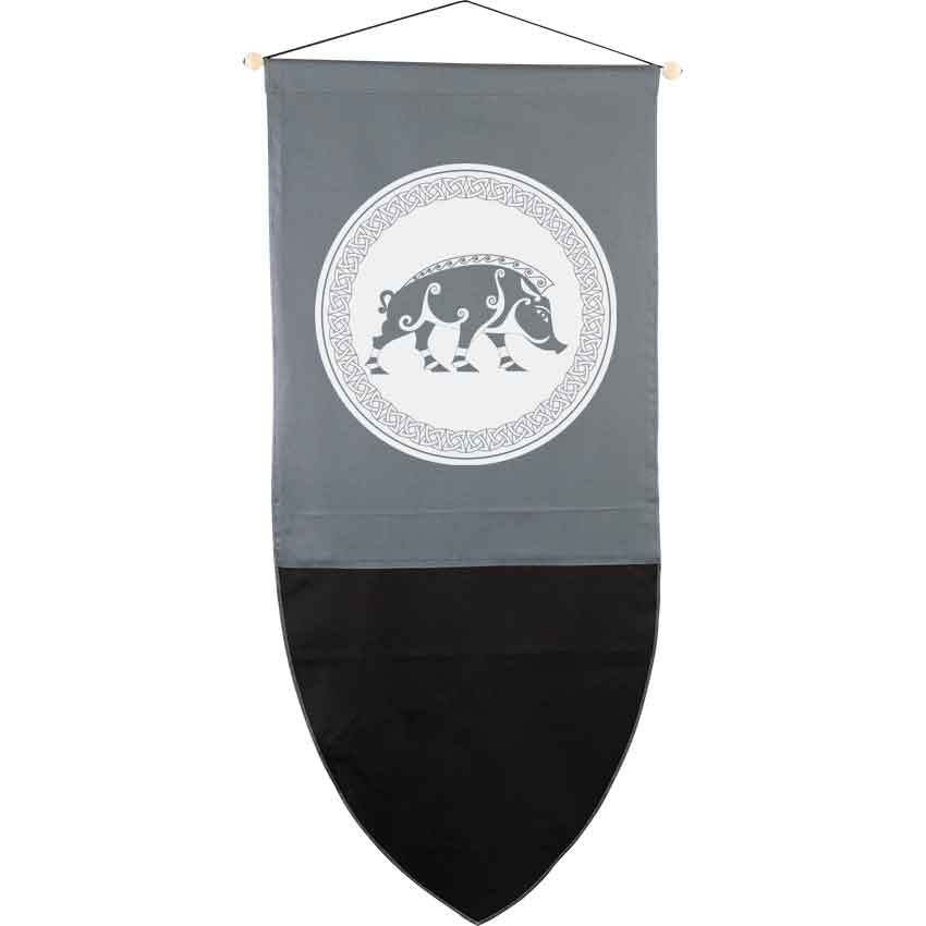 As a mighty chieftain, you know that you must impress your visitors. The Celtic Boar Banner hangs in the halls of your inspiring home. The cotton twill banner comes in a range of color options. A unique printing method, called direct to garment printing, creates the high-quality design. It features a circular white design. The design depicts a boar facing right. Celtic spirals adorn the boar. The boar matches the color surrounding the circle. Around the edges of the circle, there is a knotwork pattern forming a border. In addition, this banner has a heater shield shape, so it is straight along the sides and then curves into a point at the bottom.