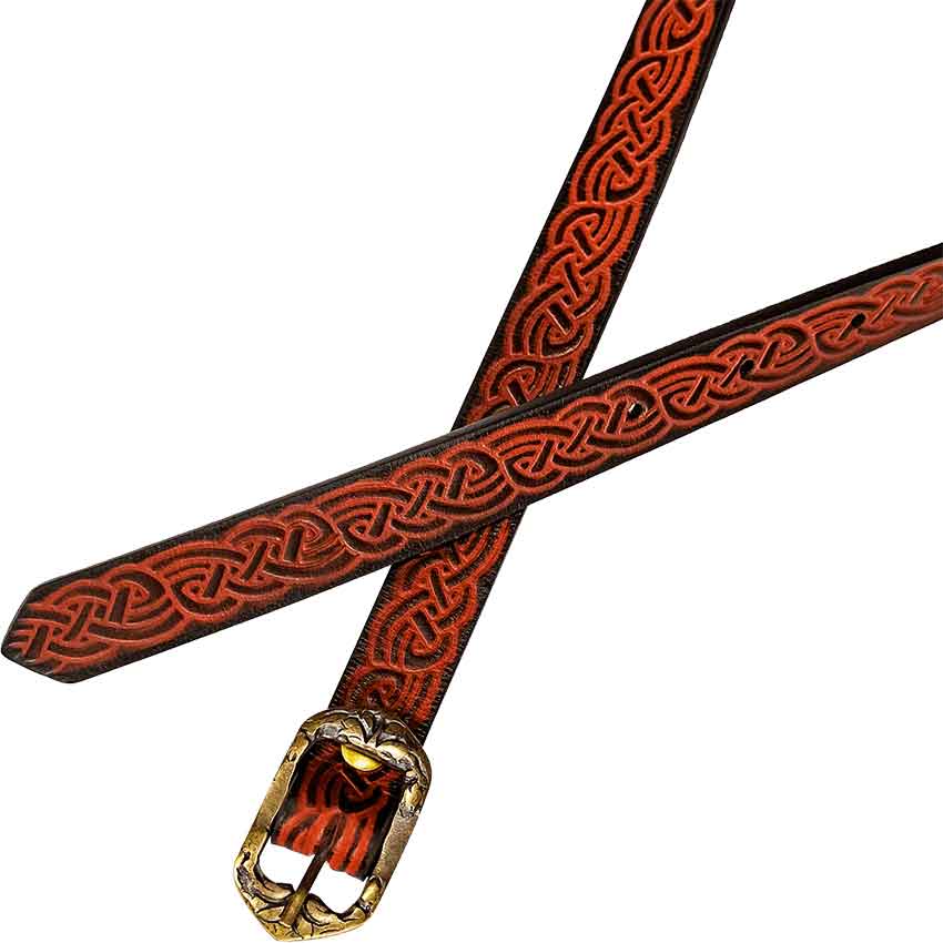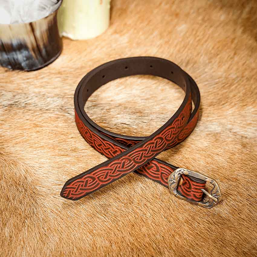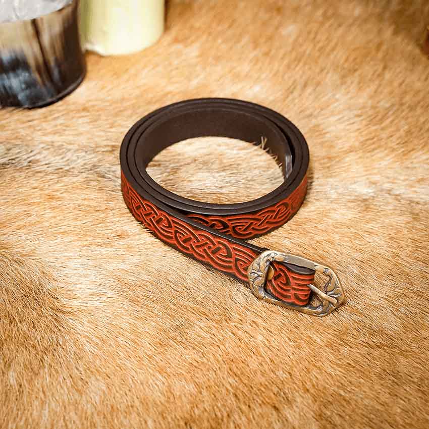 Step into the world of fantasy and history with the Brown Celtic Knotwork Leather Belt. Crafted from genuine leather, this belt boasts an embossed Celtic knotwork design that embraces the spirit of ancient Celts and Vikings. It is more than just a belt – it is a statement of character and a nod to a time gone by.