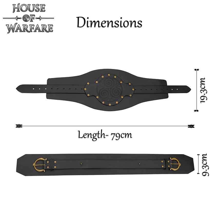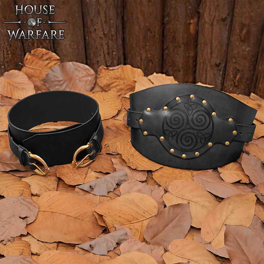 The belts design is further enhanced by a curved top and bottom edge in the front, mirroring the curves of the triskele and adding a touch of elegance and sophistication.