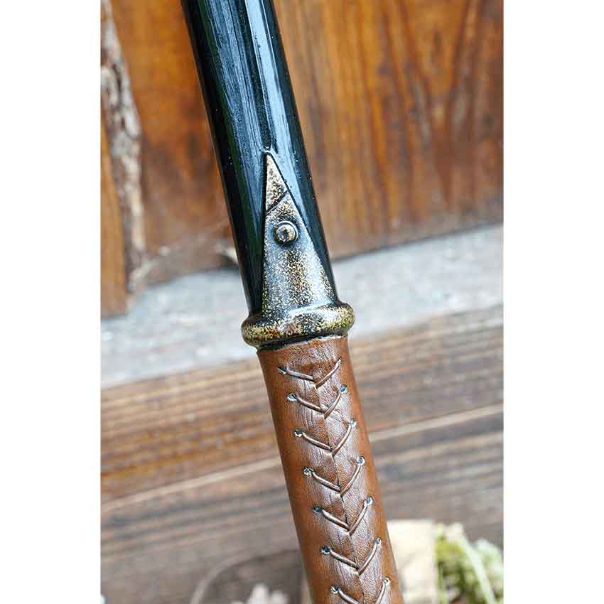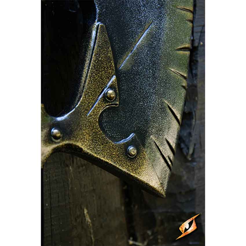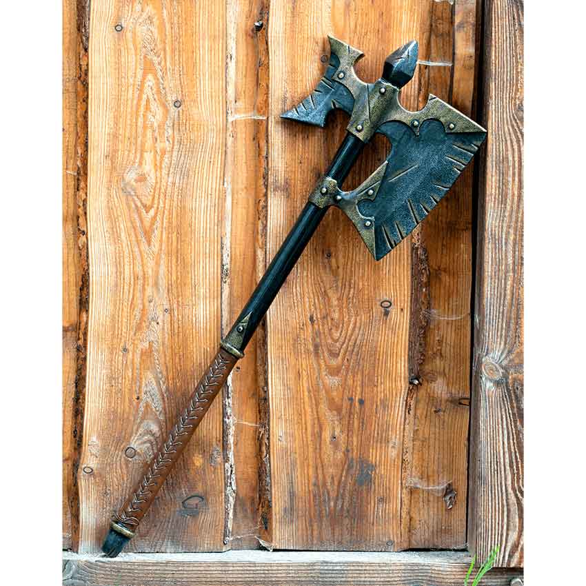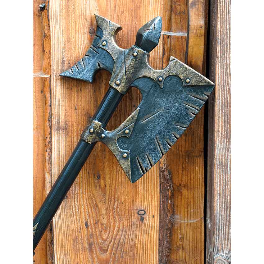 Whether a fearsome orc or rough barbarian, you love causing mayhem and disorder. Use the Chaos Axe to rampage, plunder, and pillage various towns. This axe has a soft EVA foam construction with a fiberglass rod core and a latex coating. The handle has the appearance of wrapped leather. The head features a bearded, rectangular blade with notches along the edge. The back of the axe head looks like a smaller curved blade. Brass colored accents adorn the top of the axe head and the bottom of the bearded blade. This rugged polearm is fantastic for LARP battles, cosplay, and fantasy conventions.