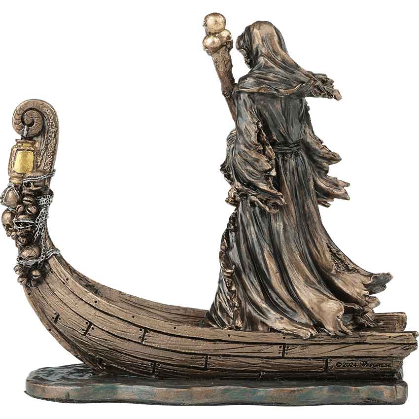 Crafted from polystone, every detail on this Charon statue has been painted by hand to show off a true passion for art. The design depicts Charon, ferryman of Hades in Greek mythology, sailing on the river Styx in his iconic boat. The statue is painted with a bronze finish.
