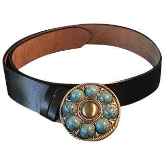 - Features circular metal belt buckle with stone details