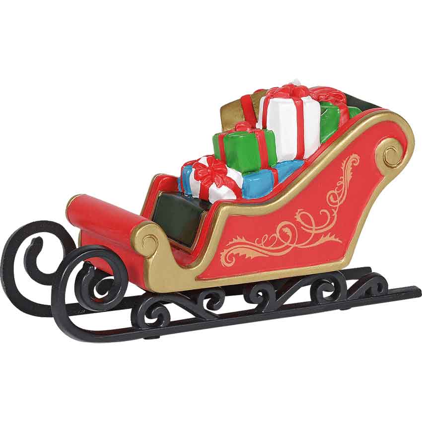 The Classic Christmas Sleigh from the Department 56 Christmas Village Accessories makes a lovely finishing touch to any Christmas scene. Made from resin, this figurine depicts a red sleigh. The sleigh sits on a white base. It features black runners at the bottom. The runners have an elegant, scrolled design. Meanwhile, the sleigh itself has a classic design with a higher back and a lower, curled front. In the black seat, there is a small mountain of presents. The presents are green, blue, white, and gold. All of the presents have a red ribbon on them. This Classic Christmas Sleigh looks great added to any wintry landscape. You can also add it to your regular holiday decorations. This hand-painted village accessory figurine is made by Department 56.