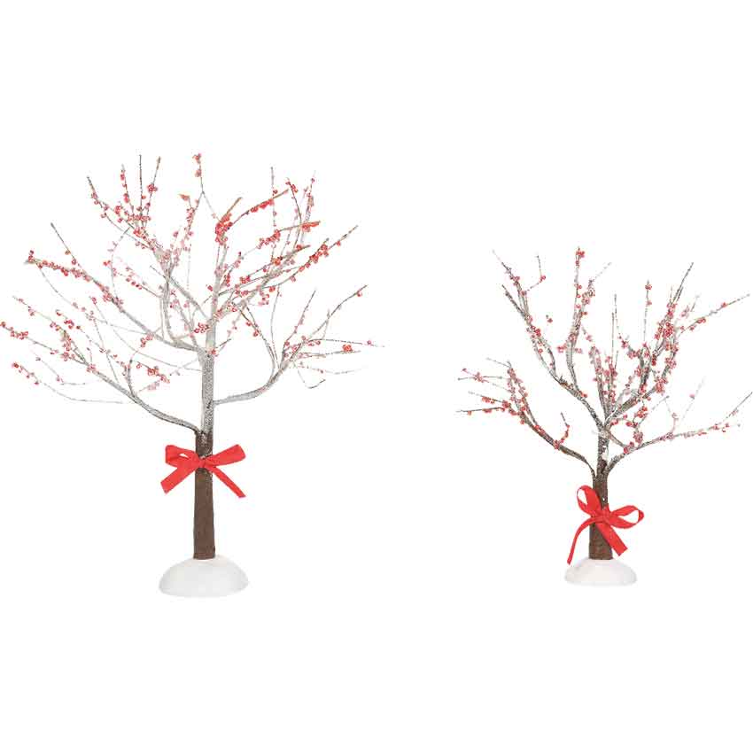 The Crabapple Trees With Ribbons from the Christmas Village Trees collection by Department 56 make a lovely finishing touch to any display. To begin with, this set of trees includes two crabapple trees. Each paper-covered wire tree has a white polyresin base and a brown trunk. Small red crabapples adorn the snow-covered branches. There is a matching red ribbon tied into a bow around the trunk of each tree. In addition, the trees are different heights. One is shorter than the other. Add this hand-painted set of Crabapple Trees With Ribbons to any mini holiday village or wintry landscape scene. This mini figurine set is made by Department 56.